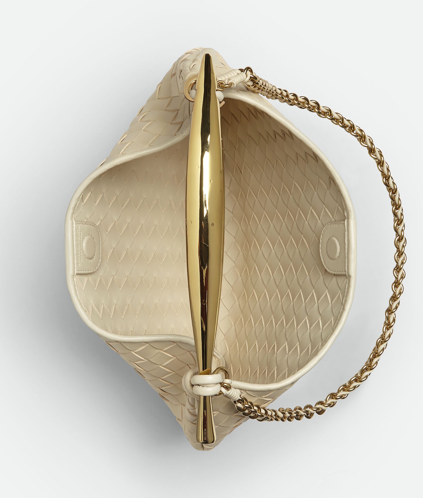 • Small Intrecciato leather bag with metallic top handle enriched by a braided leather shoulder chain