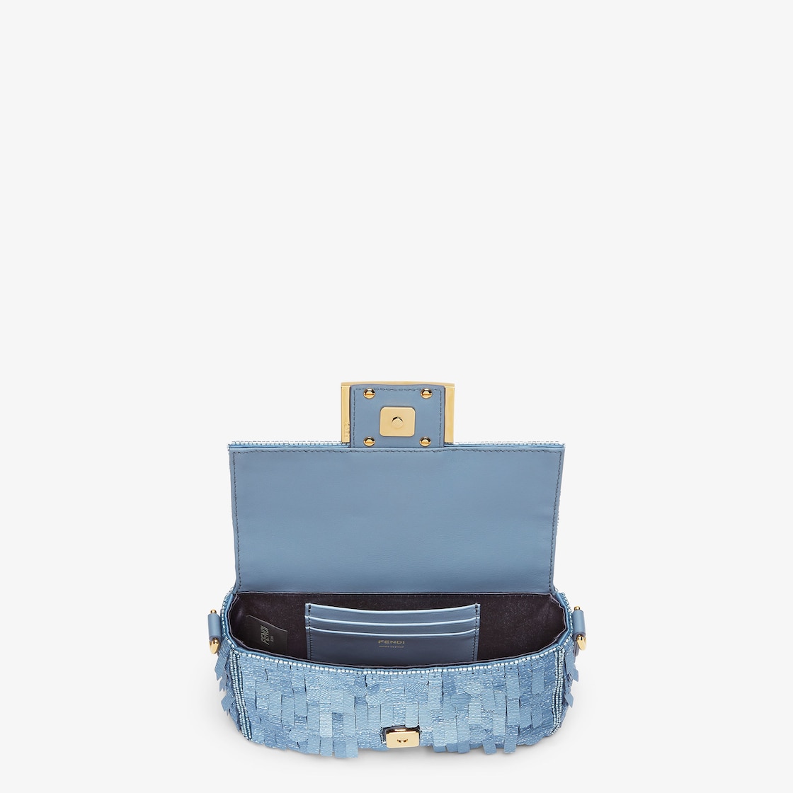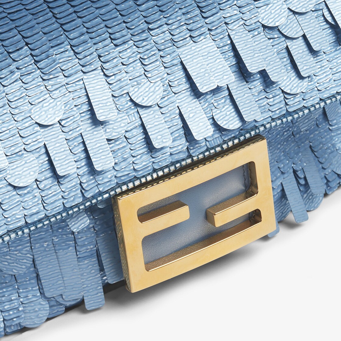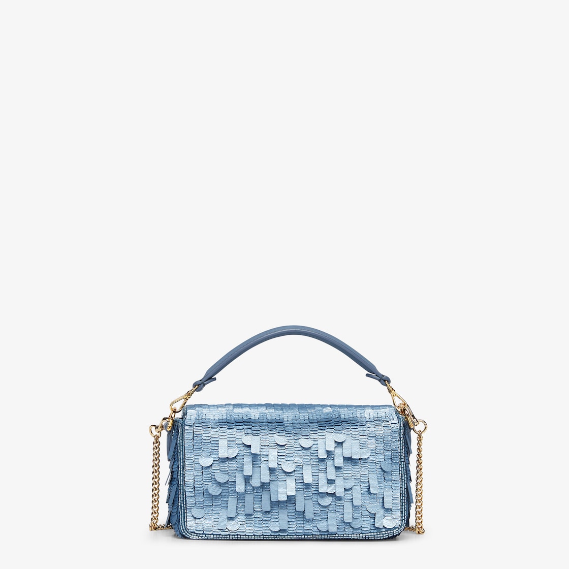 Iconic small Baguette bag, embroidered with light blue sequins of different shapes and sizes with a denim-effect finish. Trimmed in light blue calfskin and embellished with an FF clasp.