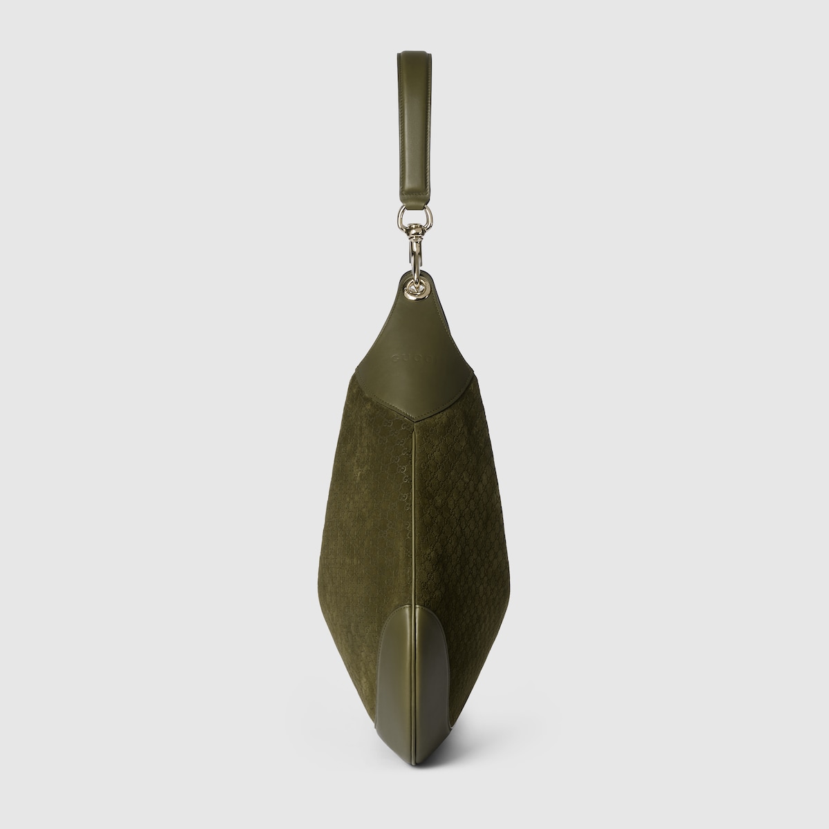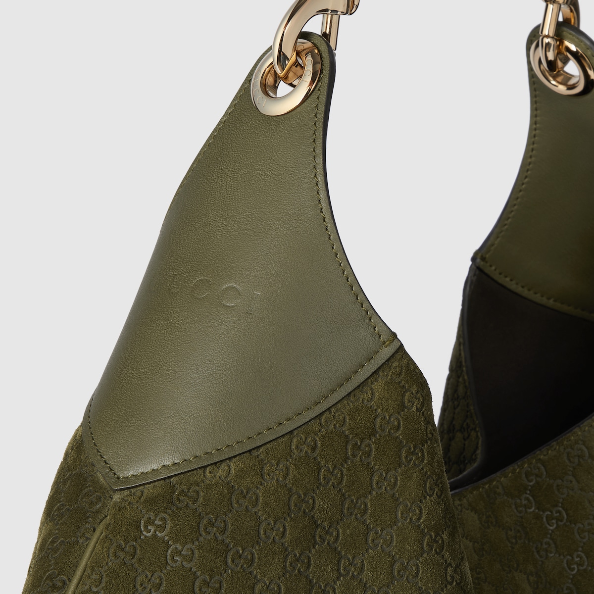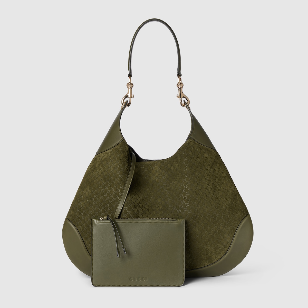 Introducing the Gucci B, which draws inspiration from a 1950s archival style. This medium shoulder bag, embodying the essence of its mid-20th century design origins, is crafted from soft suede which drapes on the body.