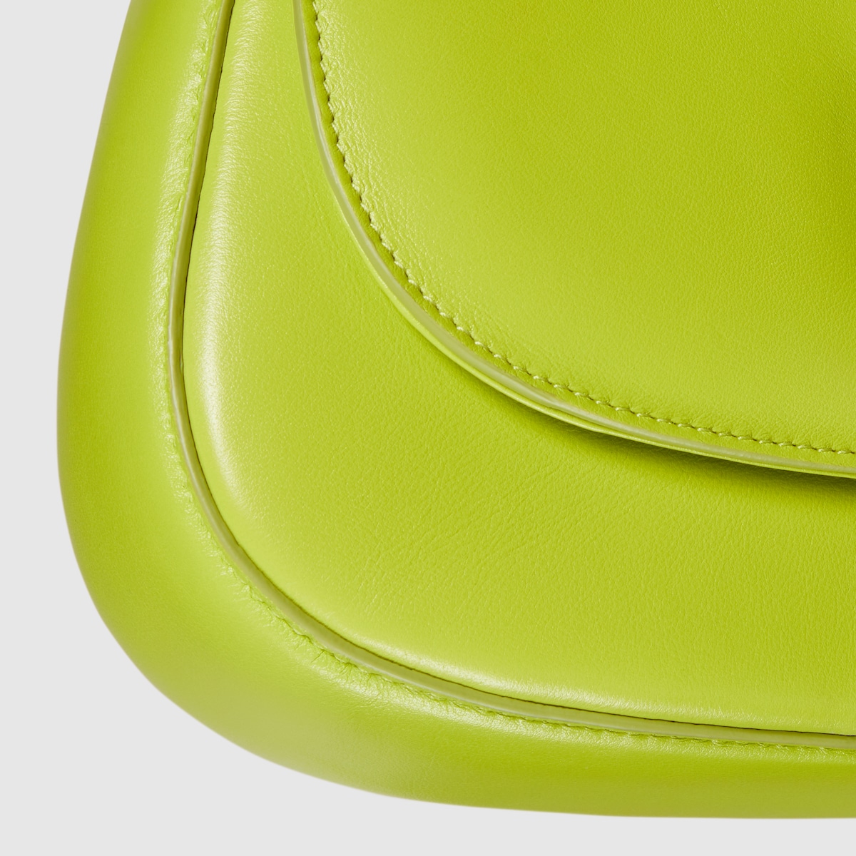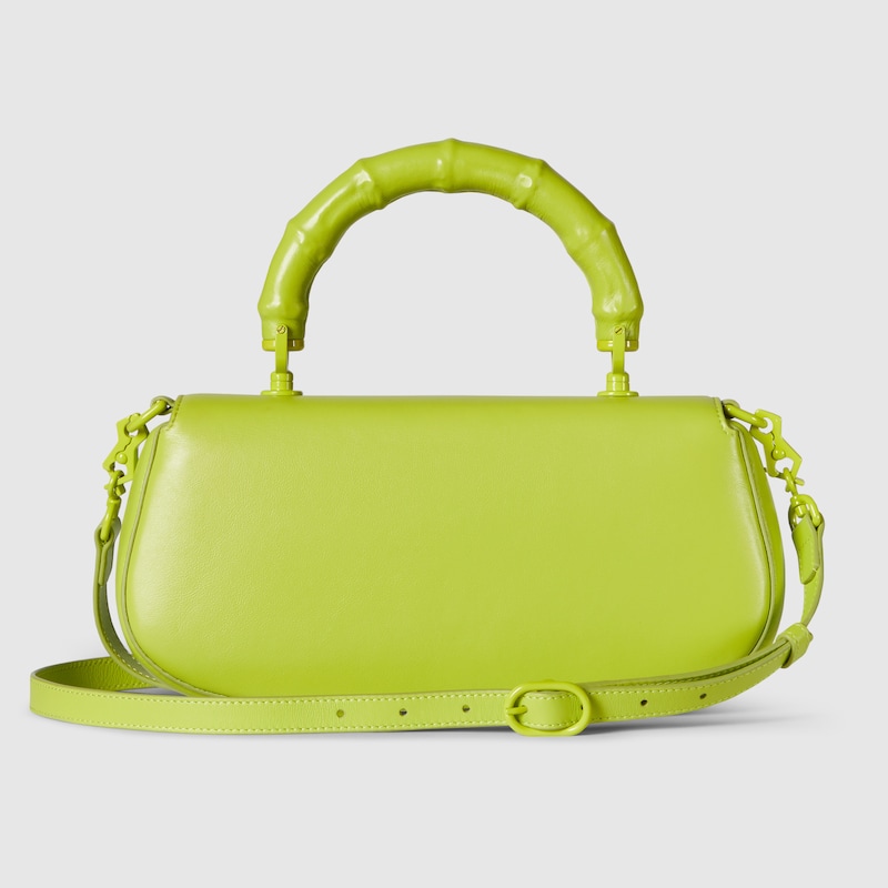 In the Spring Summer 2025 collection, this small top handle bag in soft leather reinterprets the signature bamboo motif with monochromatic hardware. Gucci Bamboo Diva is the starring feature for any look.