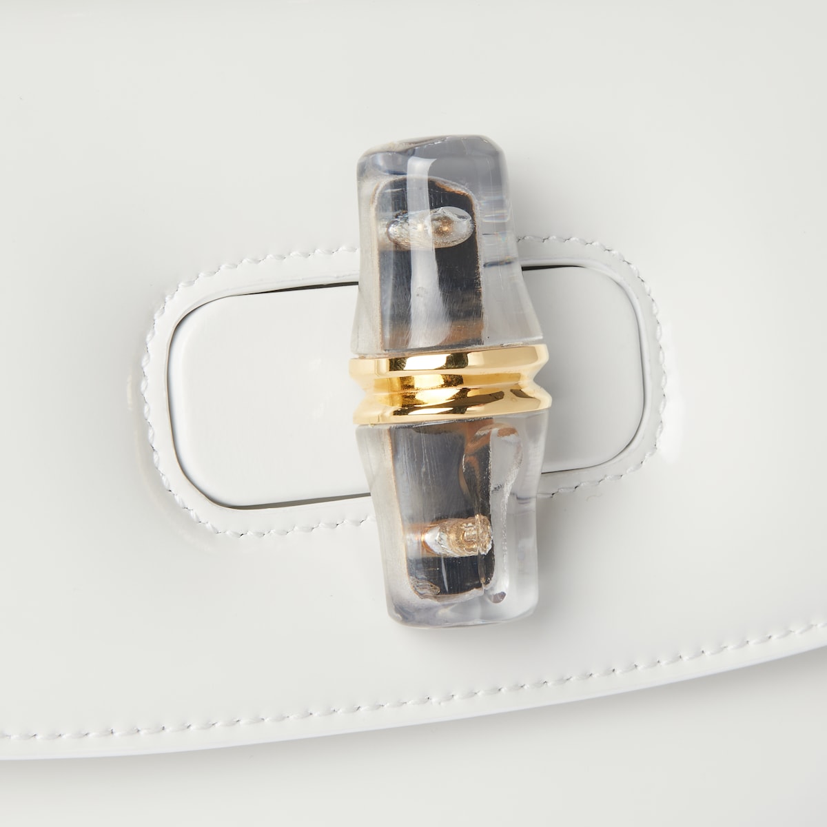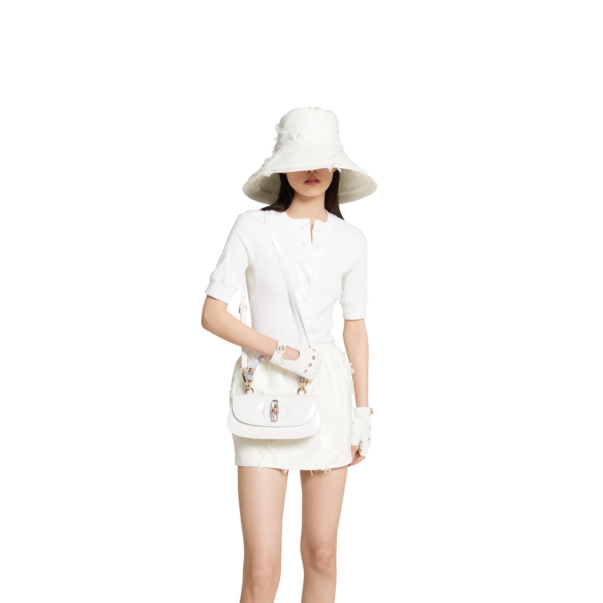 In the Spring Summer 2025 collection, this small top handle bag reinterprets the signature bamboo hardware with resin and brass details. Gucci Bamboo Diva is the starring feature for any look.