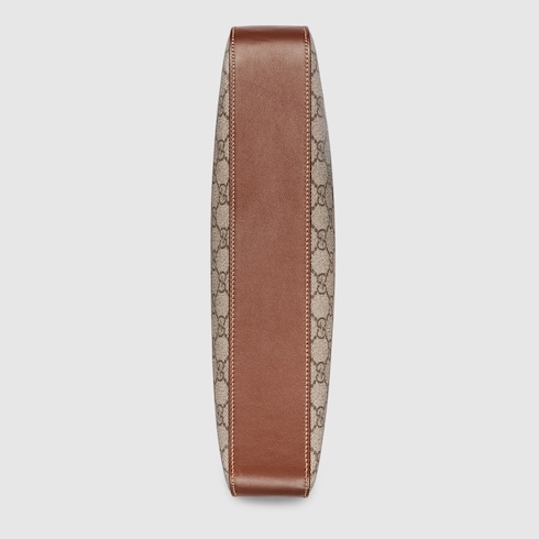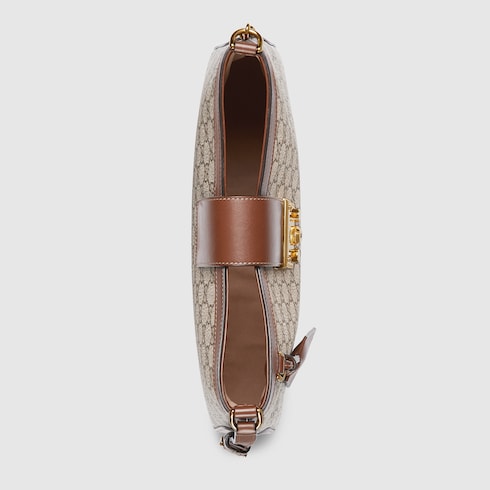 Drawing from the House’s origins as an artisanal luggage atelier, the Padlock closure features prominently on this shoulder bag in GG Supreme canvas. It is complete with gold-toned hardware, smooth brown leather trim, a chain and leather shoulder strap.