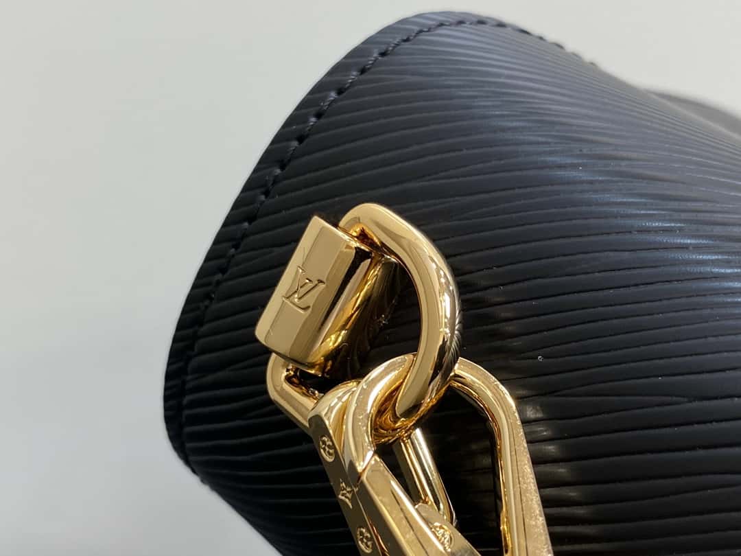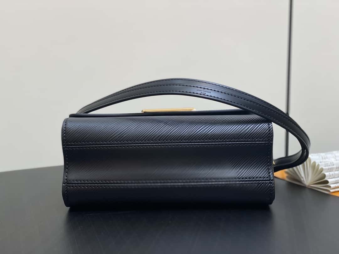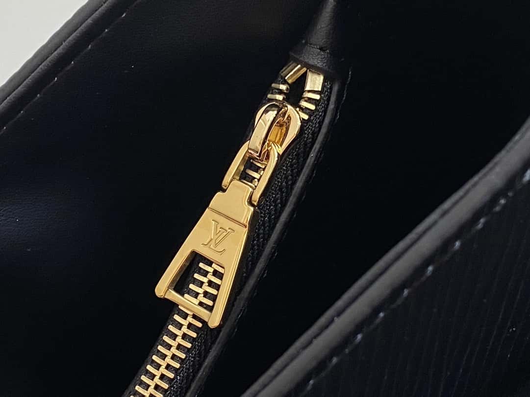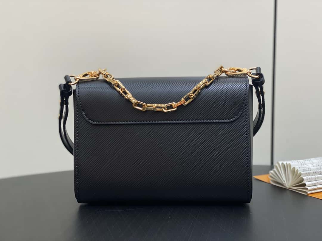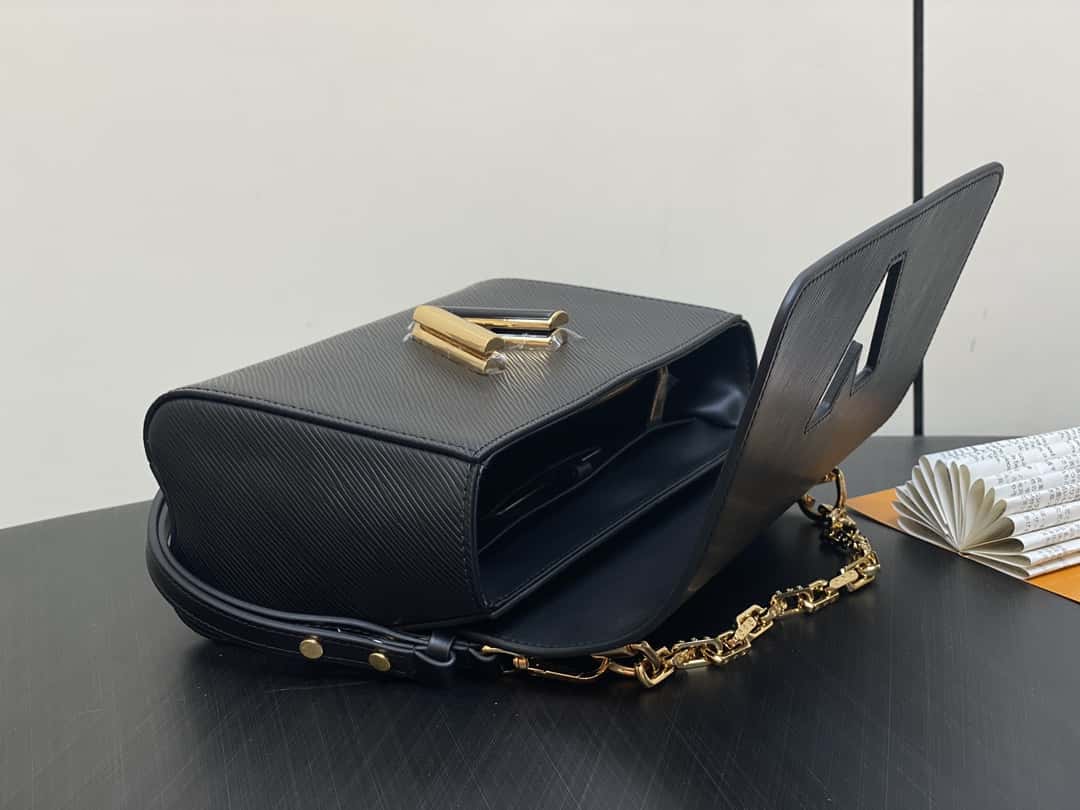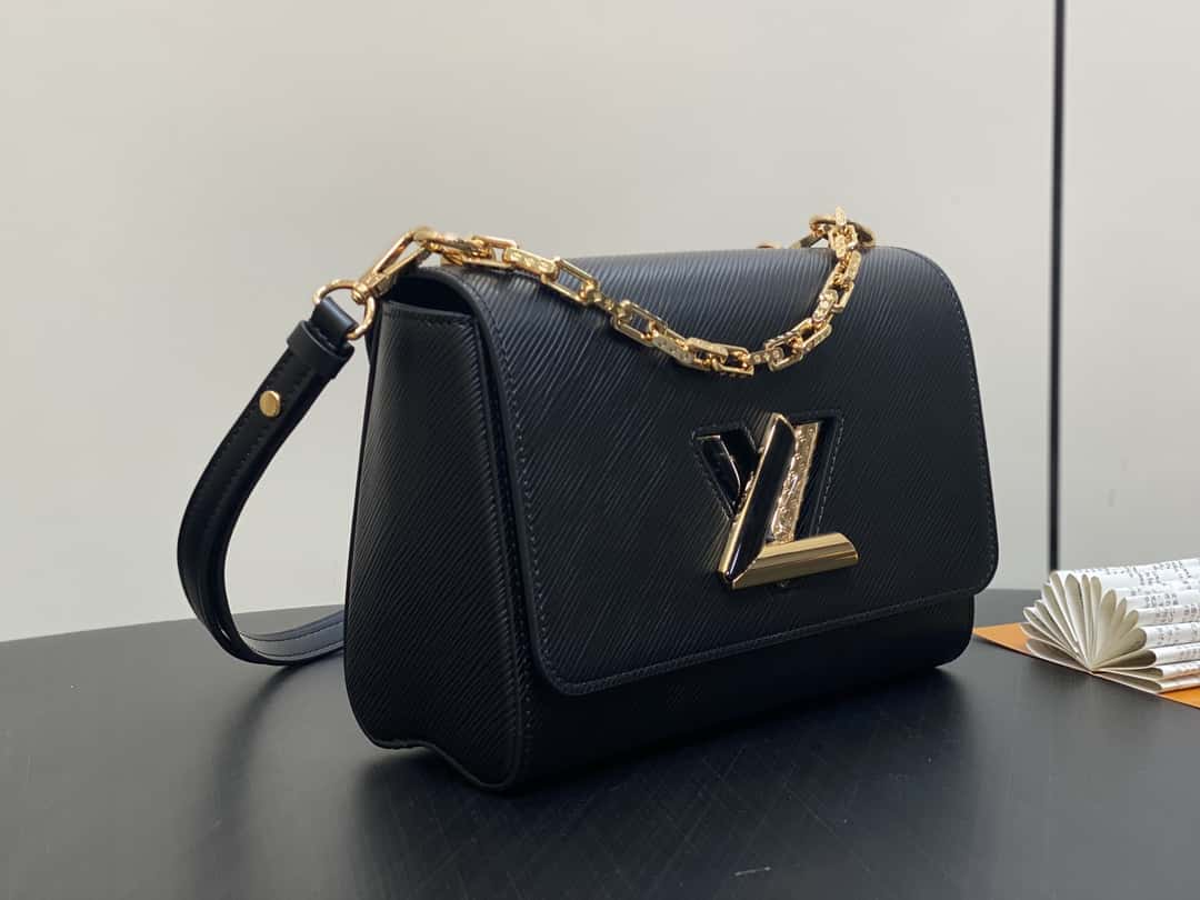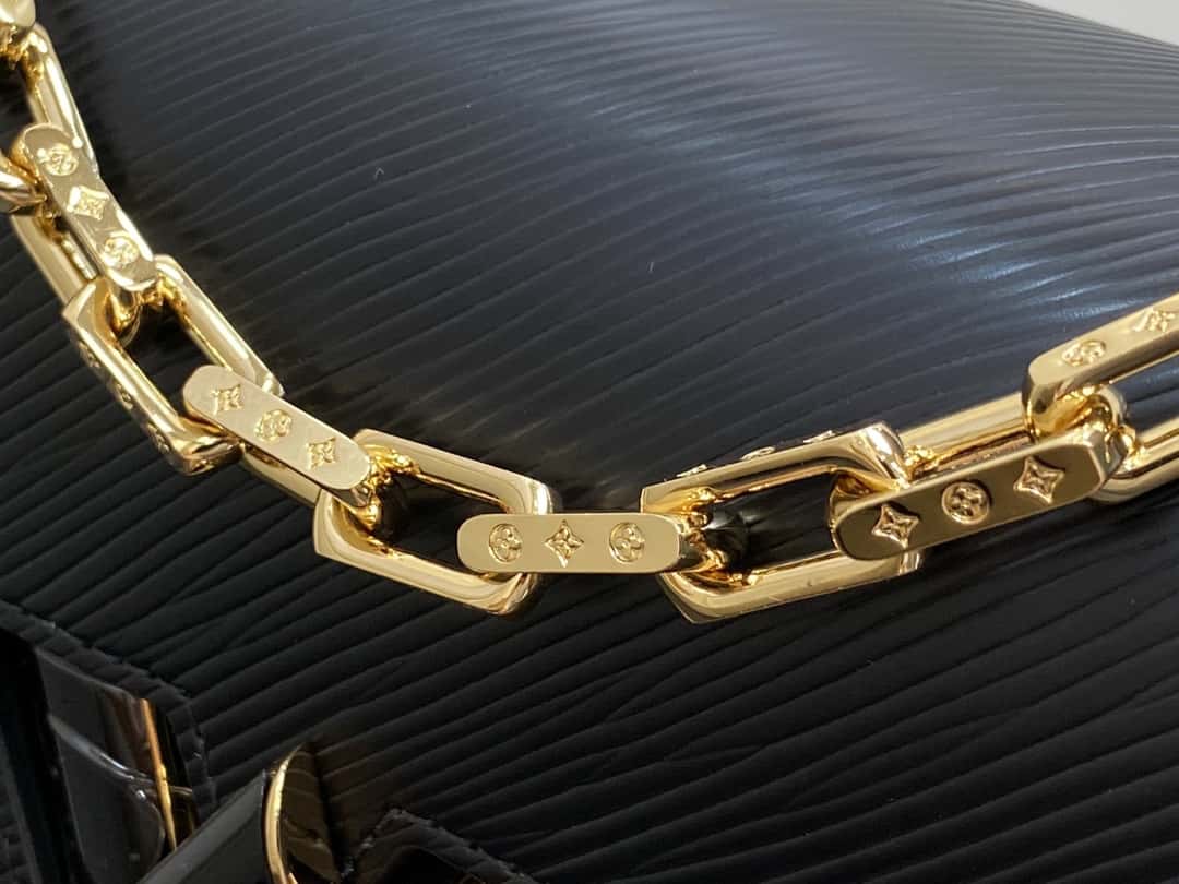 This arty version of the Twist MM handbag is fashioned from Epi leather, with its distinctive embossing, and is adorned with a brilliant decorative chain. The removable and adjustable chain is made of hand-enameled and nanogram-engraved links. The signature Twist lock features engraved Nanogram details