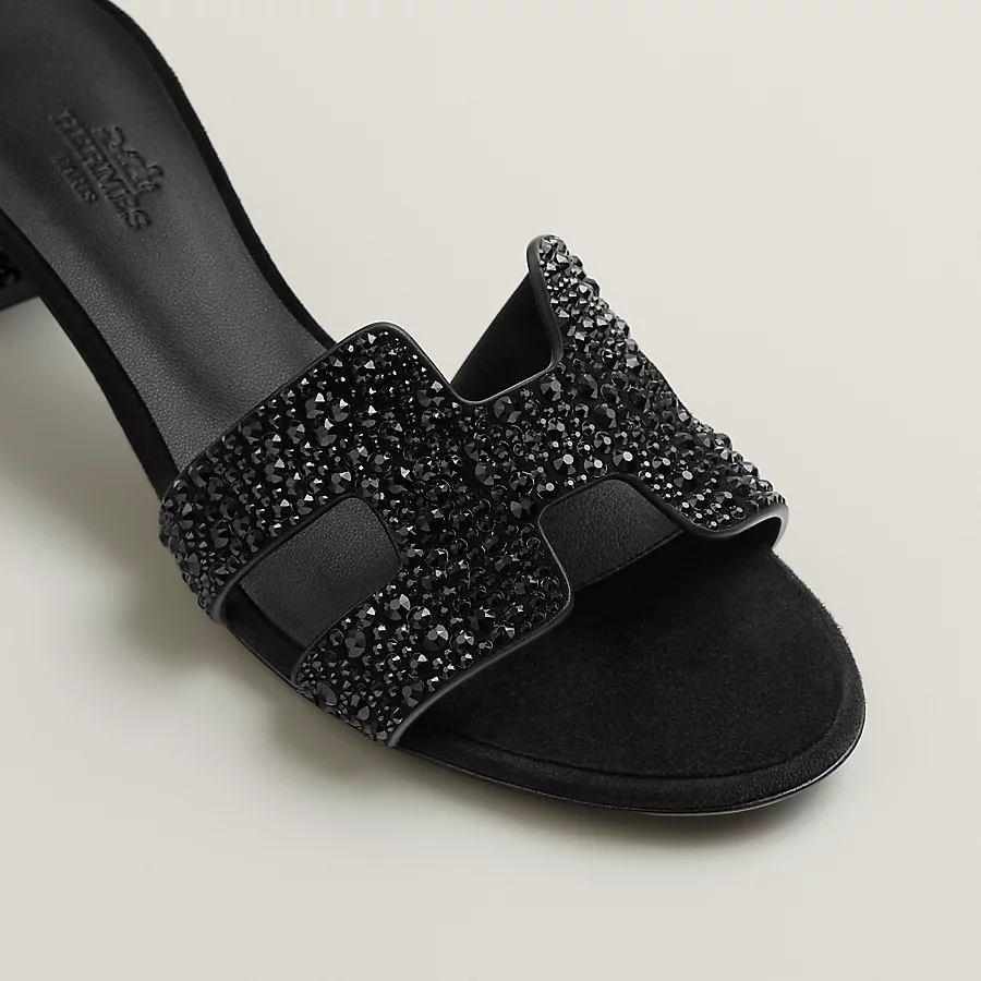High heel sandal in suede goatskin with iconic “H” cut-out and rhinestone details.