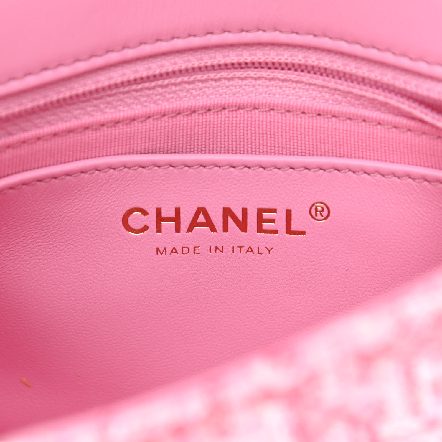This is an authentic CHANEL Tweed Resin Quilted Mini Heart Square Flap in Pink and White. This stylish shoulder bag is crafted of colorful tightly woven tweed with diamond stitching in pink and white. The bag features a light gold chain link shoulder strap with resin multicolor hearts and a clear CC and gold turn lock. This opens to a pink fabric interior with a zipper pocket.
