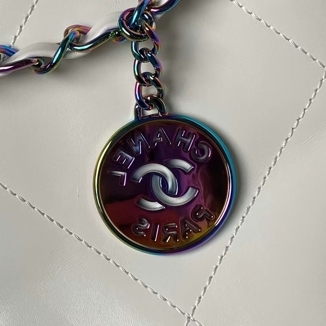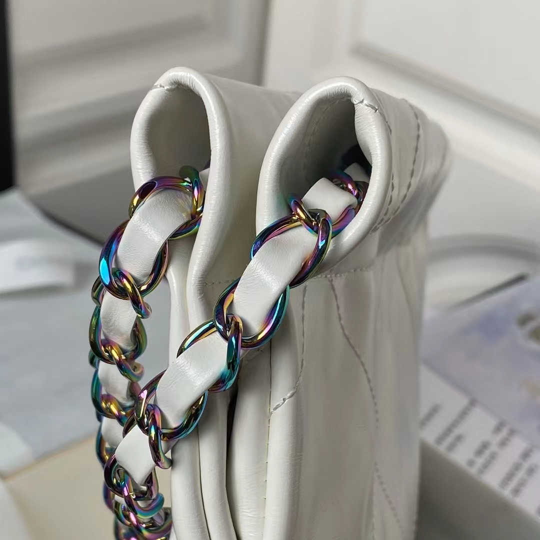 This Chanel Small 22 Hobo Bag is crafted from white calfskin leather with silver-tone metal hardware and signature diamond quilting, white-tone metal ‘Chanel’ logo on the front, Chanel Paris metal hangtag, silver-tone metal and white leather interlaced chain links, long leather cord and long chain link shoulder strap.