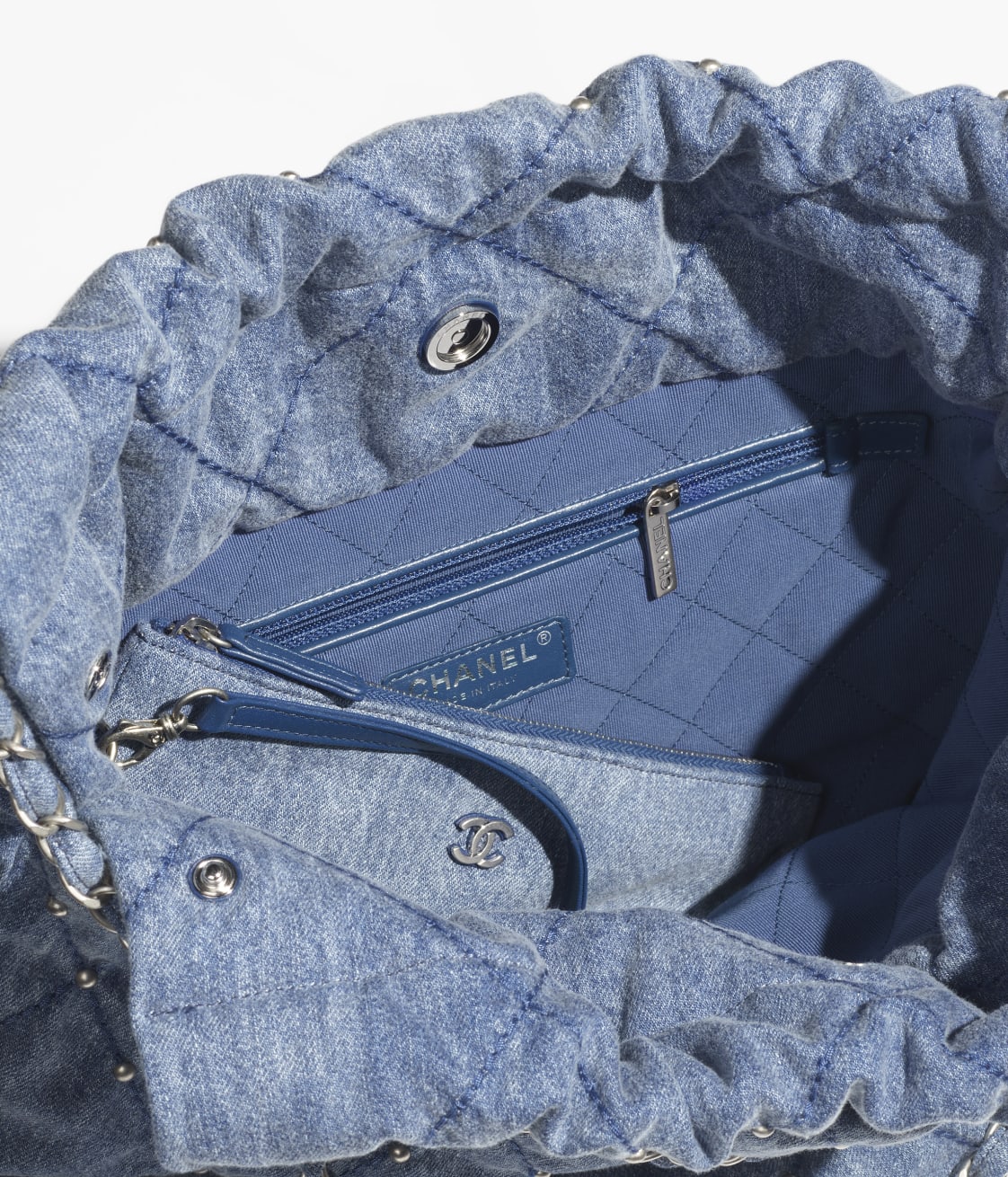 This small 22 Hobo bag is made of blue stitched denim with silver hardware, signature diamond quilting and small silver rivets on the front and bag, silver metal “Chanel” logo on the front, Chanel Paris metal hangtag, silver metal interwoven chain links, blue leather shoulder strap and a long leather cord.