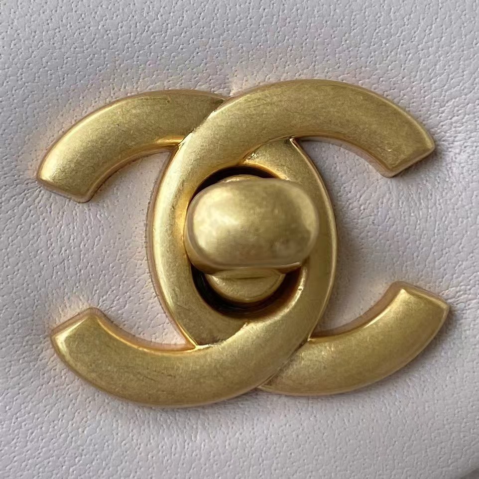 Interior lined with metallic gold leather with zippered pocket with Chanel zipper and open pocket underneath.