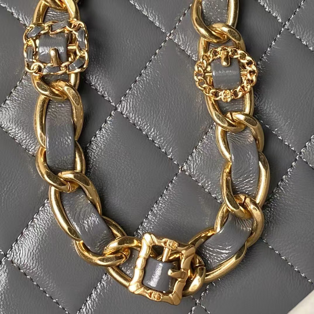 This top handle flap bag is crafted from grey lambskin with light gold hardware, front flap closure with CC turnlock clasp, interwoven light gold chain links and grey leather shoulder/crossbody strap.
