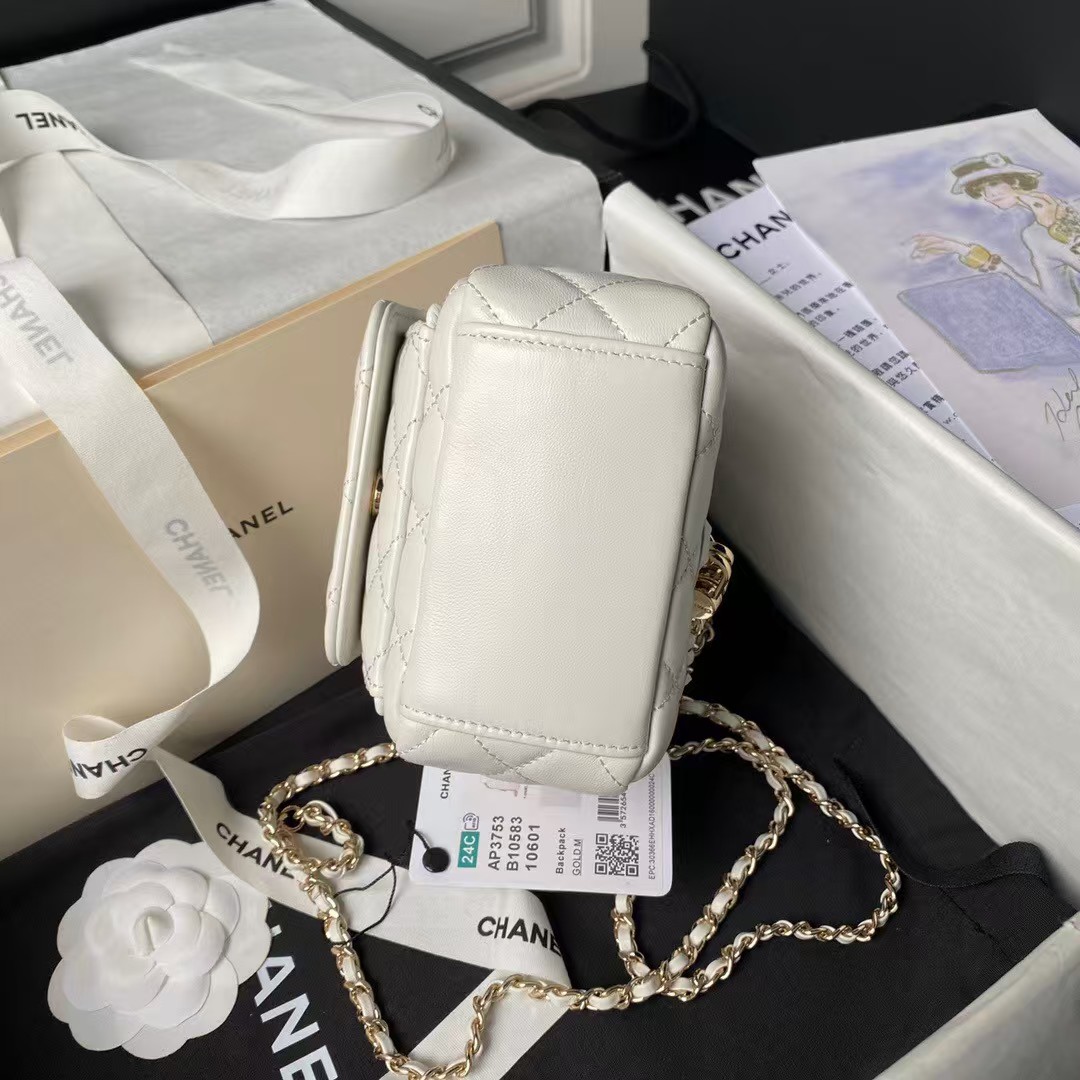 This Mini Phone Holder Backpack with Chain is crafted from white lambskin leather with light gold hardware, and features a backpack-style bag, small front snap coin pocket with CC logo, leather top handles, full zip closure with leather zipper and CC logo charm, and a convertible light gold chain interwoven with a white leather crossbody/shoulder strap.