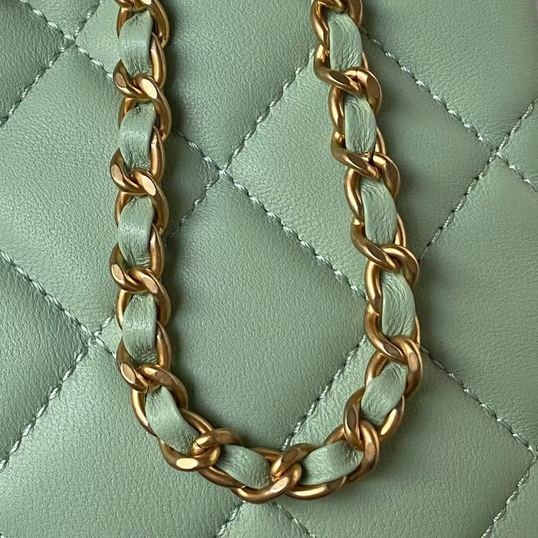 This CC shoulder bag is in light green lambskin with antique gold hardware, tonal stitching, circular construction, large antique gold CC buckle snaps that fold over the top front of the bag.