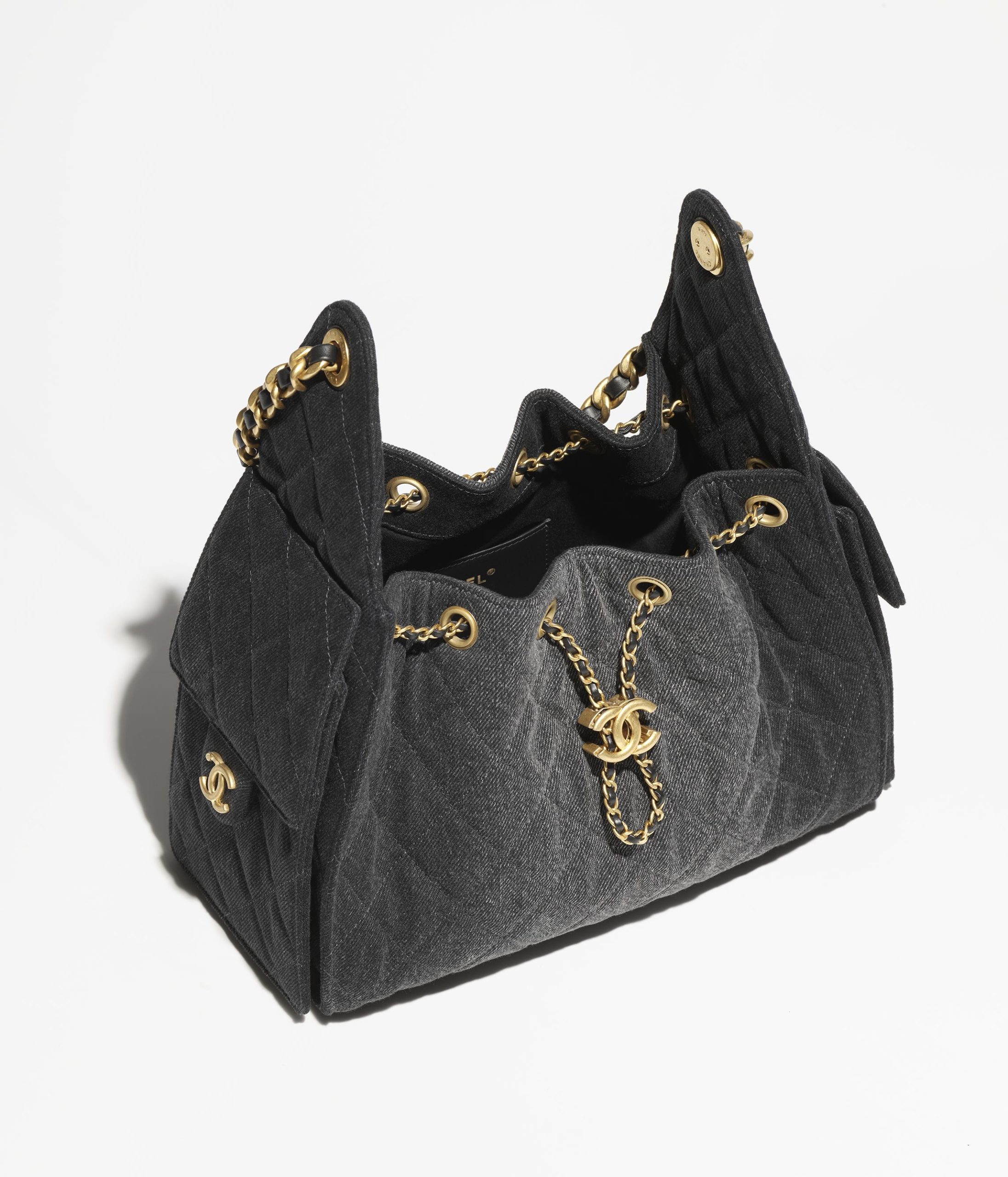 The Chanel Small 25 Hobo Bag is crafted from black washed denim with antique gold hardware and features signature diamond quilting, two exterior pockets, a drawstring closure, and an interwoven antique gold and black leather shoulder strap.