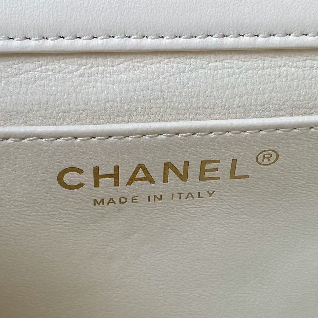 Interior lined in white lambskin with a slip pocket on the back wall.