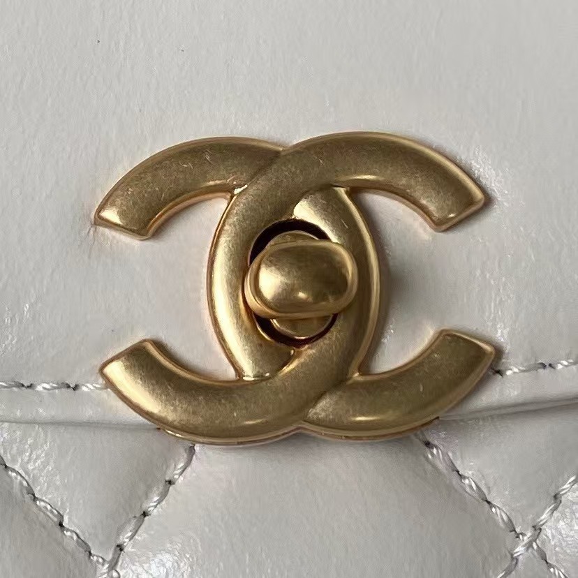 This Mini Kelly bag is crafted from white calfskin leather with brushed gold hardware, tonal stitching, two flat back top handles, interwoven brushed gold and white leather shoulder straps and signature CC turnlock closure.