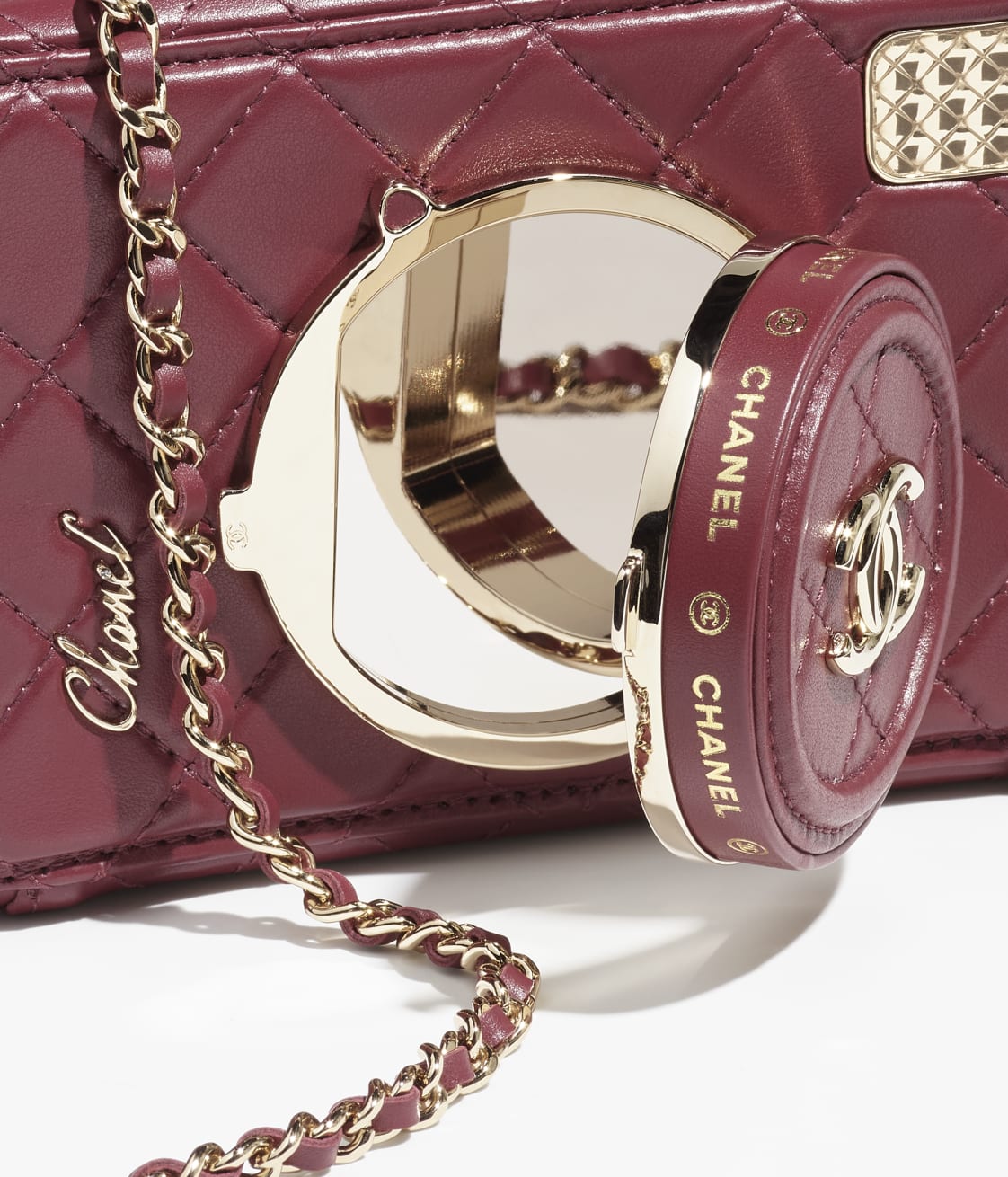 The new camera bag uses diamond quilted sheepskin to create a cute and playful camera shape. The “lens cover” is embellished with the classic double C logo. When opened, it is an exquisite and practical makeup mirror. There are 4 colors to choose from: black, white, dark beige and burgundy, and it comes with a signature leather chain shoulder strap.