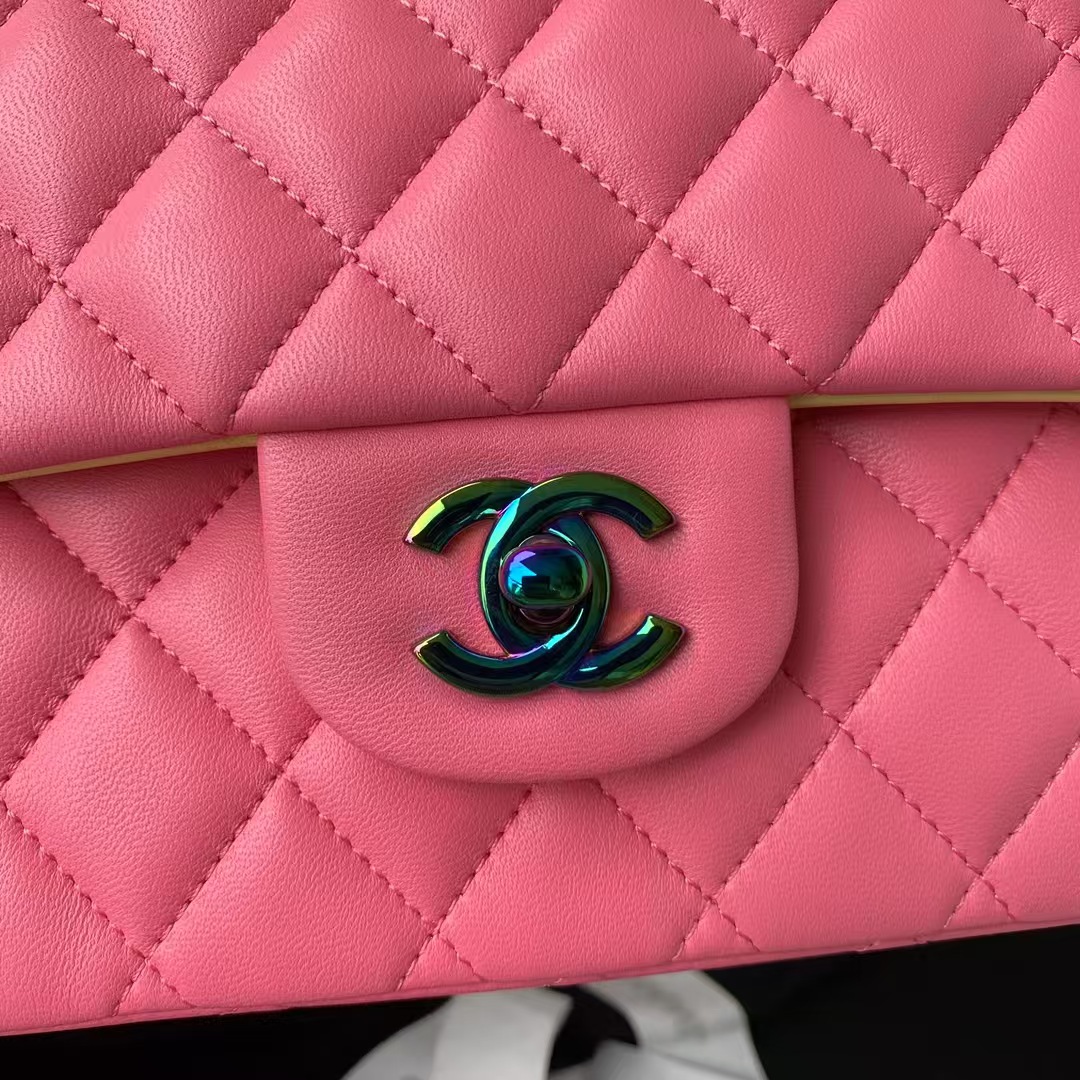 This medium classic double flap bag is crafted in dark pink lambskin leather with ombre metal hardware, front flap with signature CC turnlock closure, half-moon back pocket, adjustable interwoven ombre chain and dark pink leather shoulder strap.