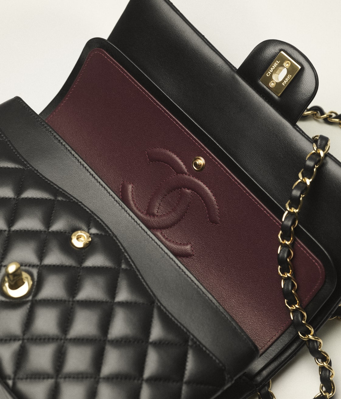This flap bag is crafted in black lambskin and light gold hardware, with the signature CC turnlock closure on the front flap, a half-moon pocket on the back, and a single interwoven black leather and light gold chain link shoulder/crossbody strap.