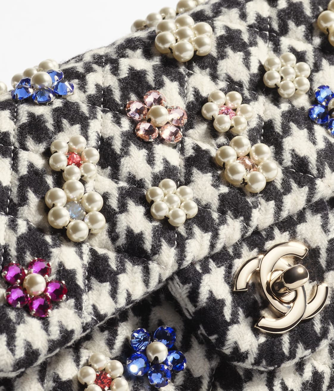 This Chanel Mini rectangular flap bag is interwoven with tweed and pearls and features light gold hardware, a front flap with CC turnlock closure, half-moon back pockets, interwoven light gold chain links and a black shoulder/crossbody strap.