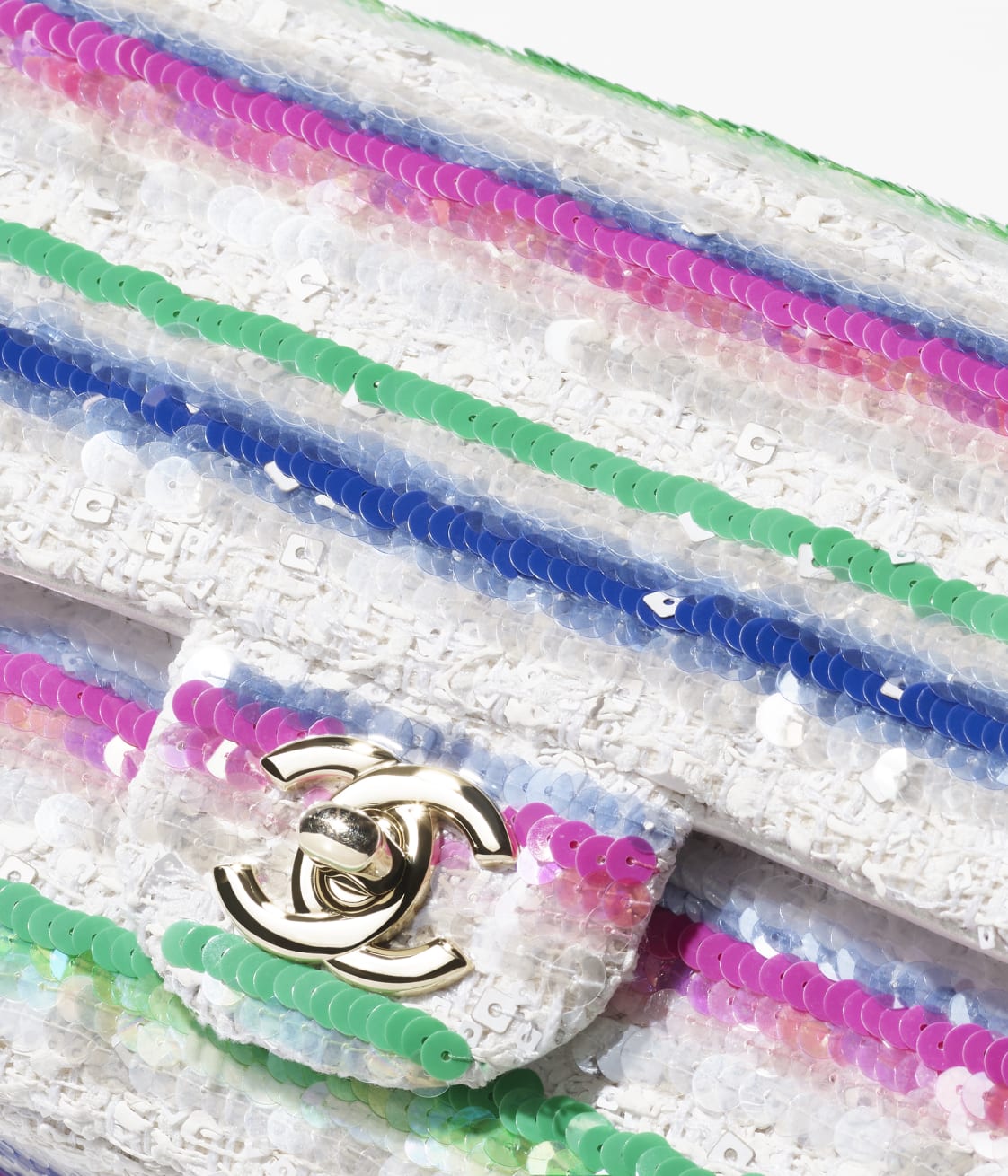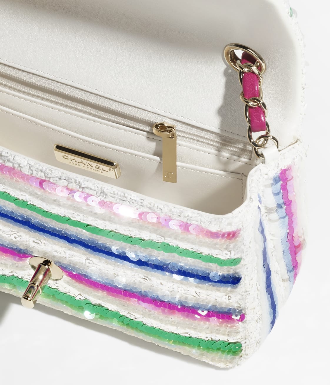 This Chanel Mini Rectangular Flap Bag in colorful sequins and white tweed features light gold hardware, a front flap with CC turnlock closure, half-moon back pockets and interwoven light gold links, and a pink shoulder/crossbody strap.