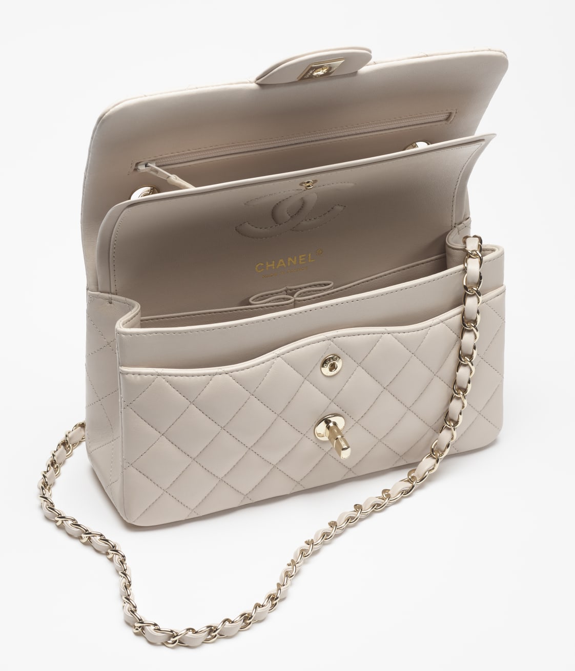 This small classic double flap bag is crafted in light beige lambskin with gold-tone hardware, featuring the signature CC turnlock closure on the front flap, half-moon back pockets, and an adjustable gold-tone interwoven chain link and light beige leather shoulder strap.