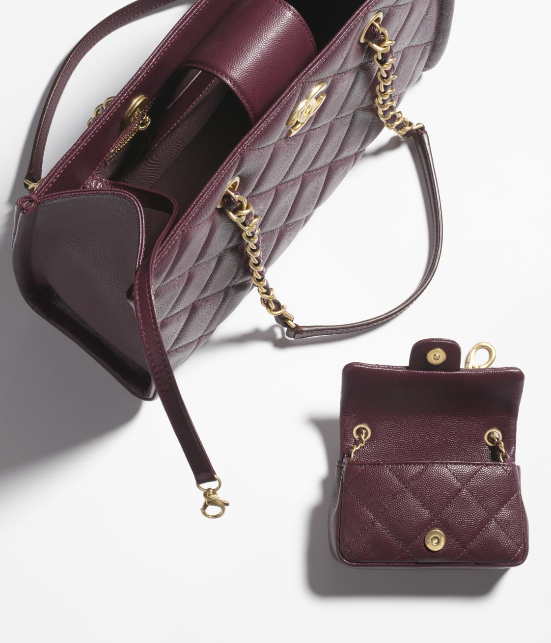 This vintage flap bag is crafted in burgundy grained calfskin with gold hardware, CC turnlock closure on the front, interwoven gold-plated chain links and burgundy leather shoulder/crossbody strap.