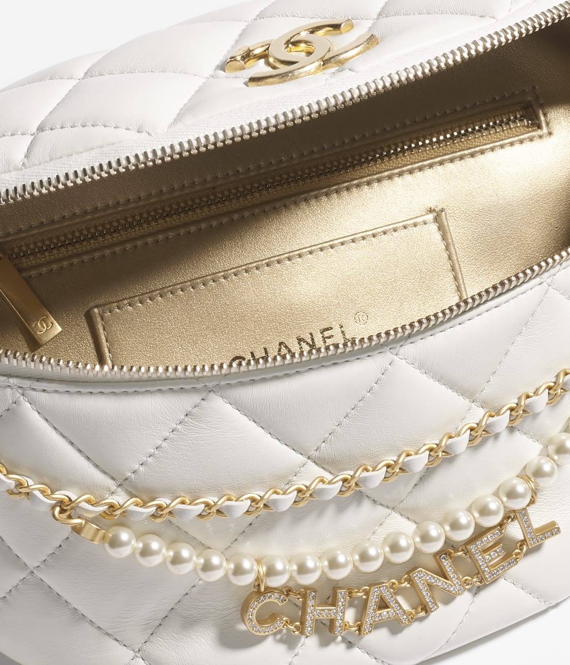 This small waist bag is made of white lambskin, imitation pearls and light gold hardware, with tonal stitching, imitation pearls and light gold hardware CC on the front, zip closure, zip pocket on the waist bag, light gold and metal interweaving, white leather chain link belt/crossbody strap.
