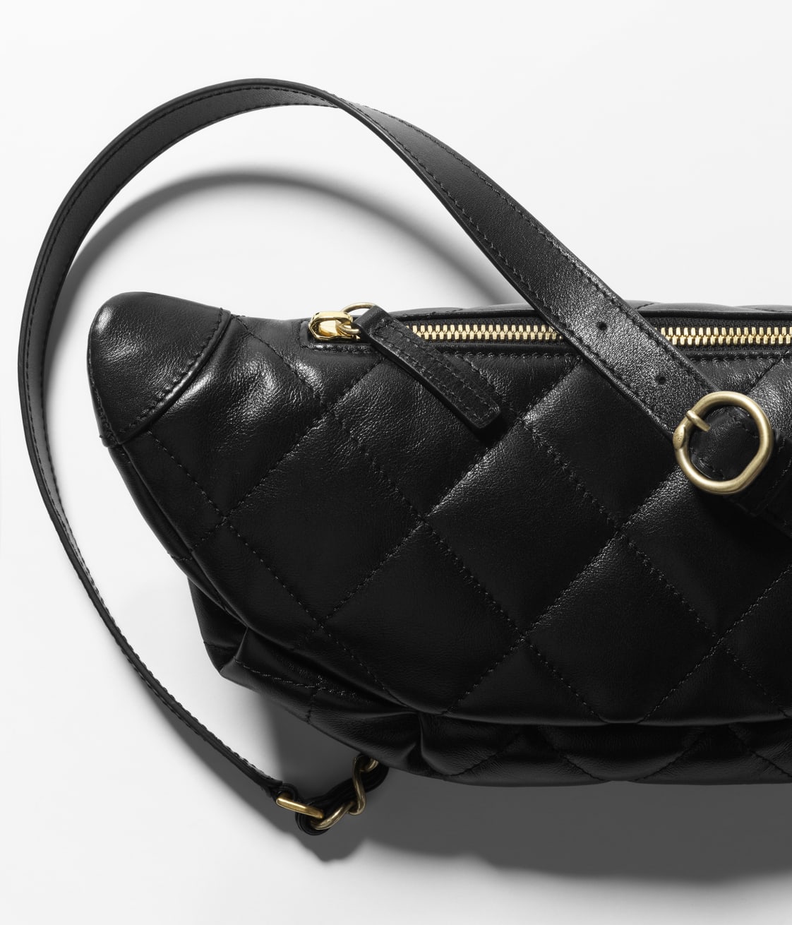 This black shiny calfskin belt bag with light gold hardware features tonal stitching and light gold hardware on the front, two small front pockets with magnetic closures, gold metal CC logo, zip pocket on the belt bag, light gold and metal interweaving, black leather chain link belt/crossbody strap.