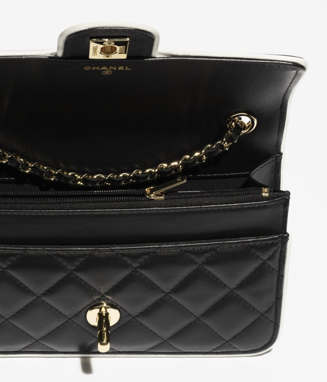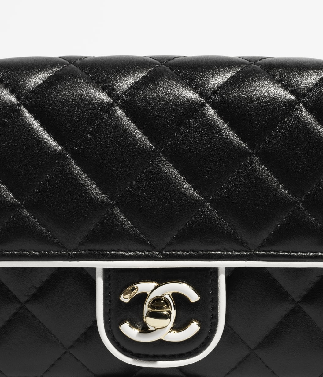 This Chanel Small Graphic Frame Flap Bag is of black lambskin leather with light gold tone hardware, featuring contrast white leather edge piping, a front flap with a light gold tone and white enamel CC turnlock closure, half moon back pocket and an interwoven light gold tone chainlink and leather crossbody/shoulder strap.