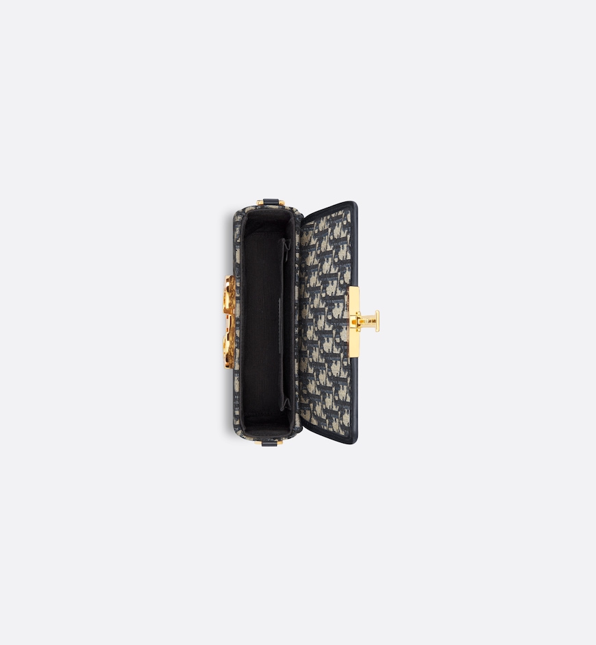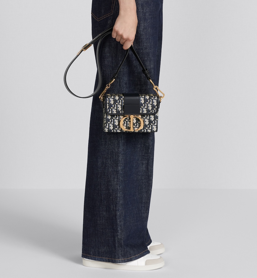 • The 30 Montaigne line, inspired by the historic, emblematic address, presents essential pieces that portray the iconic codes of the House. The compact bag is crafted in blue Dior Oblique jacquard for an elegant and modern look. The flap is embellished with an antique gold-finish metal CD clasp, inspired by the seal of a Christian Dior perfume bottle. Refined details such as an embossed 30 Montaigne signature on the back and the military-inspired buckle define this unique design. Featuring an adjustable leather shoulder strap, the 30 Montaigne box bag may be carried by hand, worn over the shoulder or crossbody.