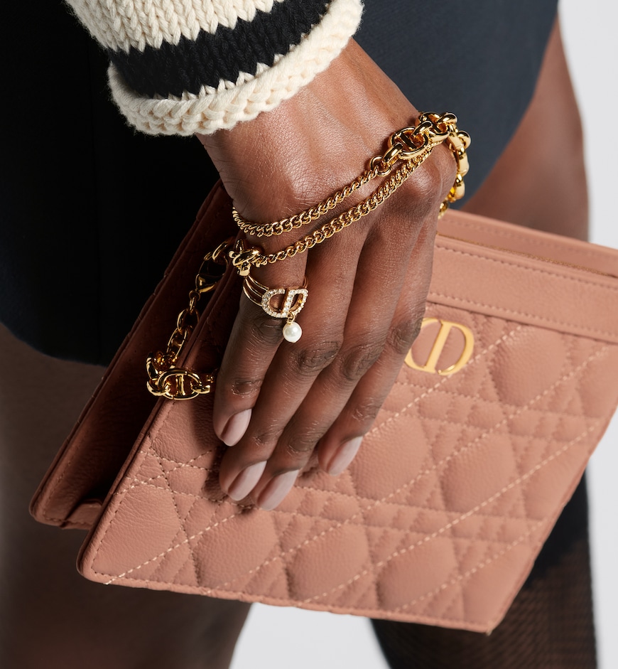 - The Dior Caro Every Dior pouch combines a modern and functional design with the House’s codes of elegance. Crafted in Rose des Vents supple calfskin, it stands out with its hallmark Cannage stitching and a CD signature on the front. Thanks to a removable chain punctuated with CD chain links, the pouch can be carried by hand, worn over the shoulder or crossbody, and pairs well with other pieces from the same line.