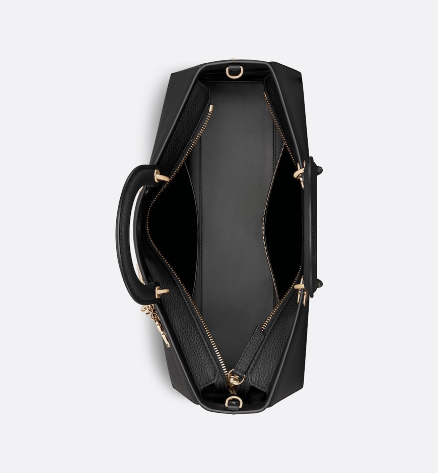 • New for Summer 2024, the Lady D-Sire bag draws inspiration from the signature elegance of the Lady Dior design. Reimagined with a casual style for an urban look, the lightweight black grained Taurillon leather feels soft to the touch yet offers excellent durability. The extra-large style is embellished with pale gold-finish metal D.I.O.R. charms that illuminate the silhouette. Showcasing a removable, thin leather shoulder strap, the unique bag can be carried by hand or over the shoulder.