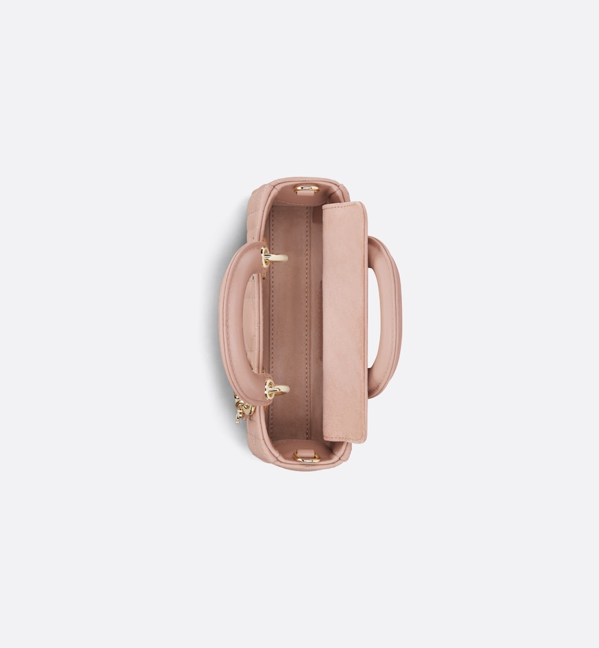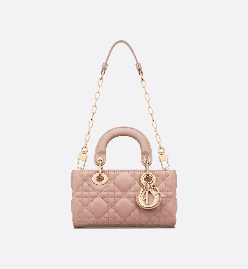 - The Lady D-Joy micro bag captures the House’s vision of elegance and beauty by showcasing the iconic streamlined aesthetic of the Lady Dior line. Sleek and refined, the timeless creation is crafted in Rose des Vents lambskin with Cannage topstitching and enhanced by a pale gold-finish metal D.I.O.R. charm. Featuring one removable chain strap and another adjustable and removable leather strap, the Lady D-Joy bag can be carried by hand, worn over the shoulder or crossbody as an ideal day or evening companion.