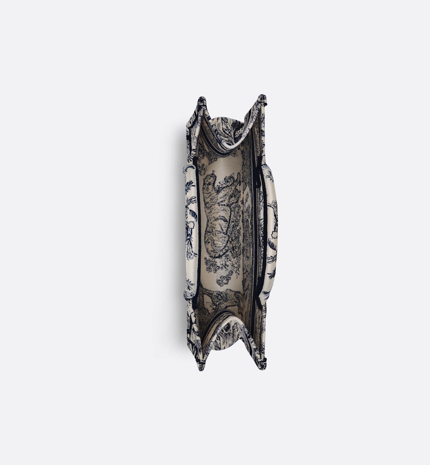 • Introduced by Maria Grazia Chiuri, Creative Director of Christian Dior, the Dior Book Tote has become a staple of the Dior aesthetic. Designed to hold all the daily essentials, the style is fully embroidered with the ecru and blue Toile de Jouy motif enhanced by the Christian Dior Paris signature on the front. The medium tote exemplifies the House’s signature savoir-faire and may be carried by hand or worn over the shoulder.