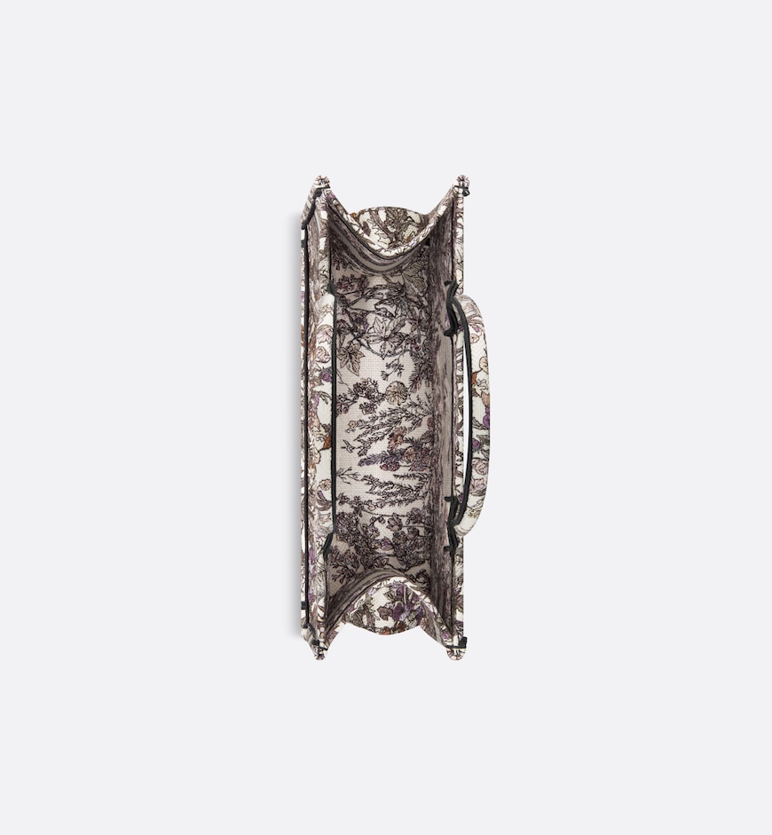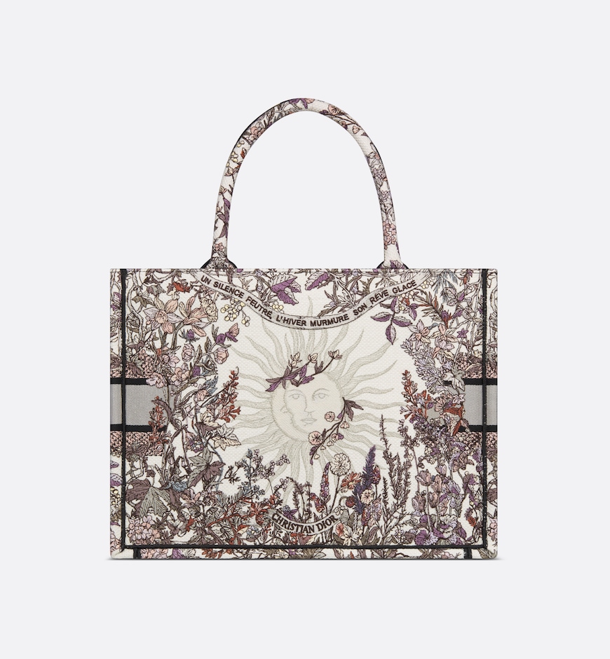 Introduced by Maria Grazia Chiuri, Creative Director of Christian Dior, the Dior Book Tote has become a staple of the Dior aesthetic. Designed to hold all the daily essentials, the ecru multicolor style is fully embroidered with the Dior 4 Saisons Hiver Soleil motif by Pietro Ruffo, celebrating the season’s signature sun theme with a bucolic wintry design punctuated by the words, Un silence feutré, l’hiver murmure son rêve glacé. Adorned with the Christian Dior Paris signature on the front, the medium tote exemplifies the House’s signature savoir-faire and may be carried by hand or worn over the shoulder.