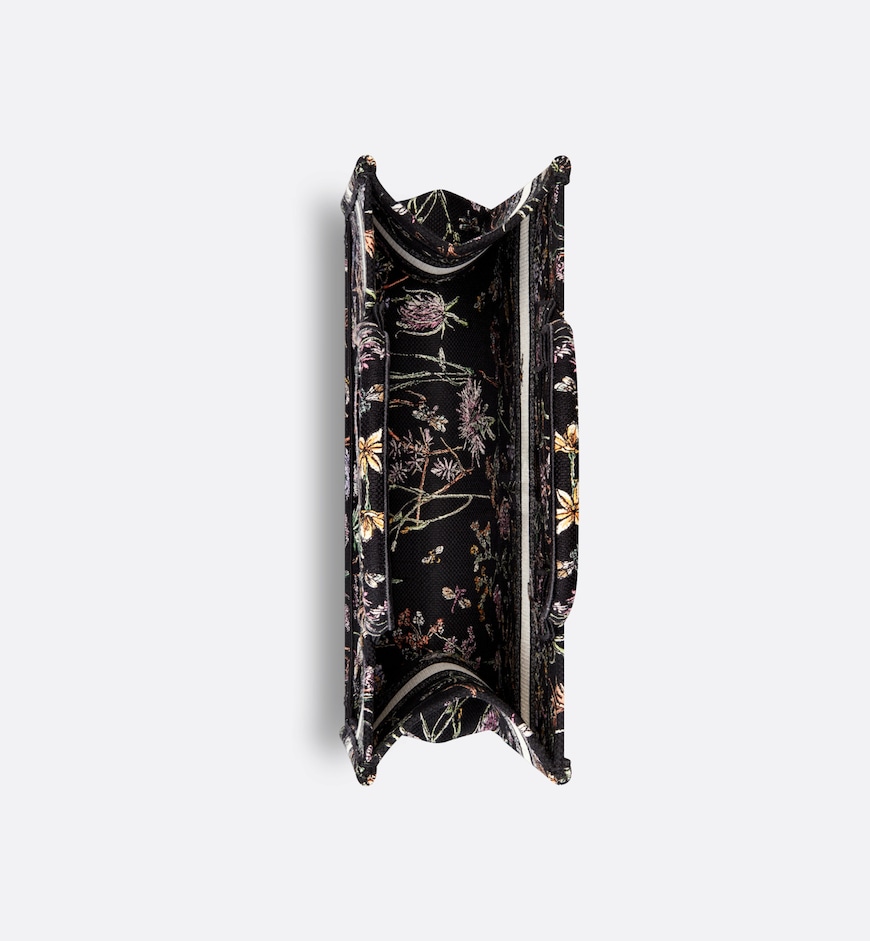 • Introduced by Maria Grazia Chiuri, Creative Director of Christian Dior, the Dior Book Tote has become a staple of the Dior aesthetic. Designed to hold all the daily essentials, the style is fully embroidered with the black multicolor Dior Herbarium motif, a vibrant homage to Mr. Dior’s passion for botanicals. Inspired by House archives, it showcases a collection of wild plants and flowers accented by dragonflies and bees. Adorned with the Christian Dior Paris signature on the front, the medium tote exemplifies the House’s savoir-faire and may be carried by hand or worn over the shoulder.