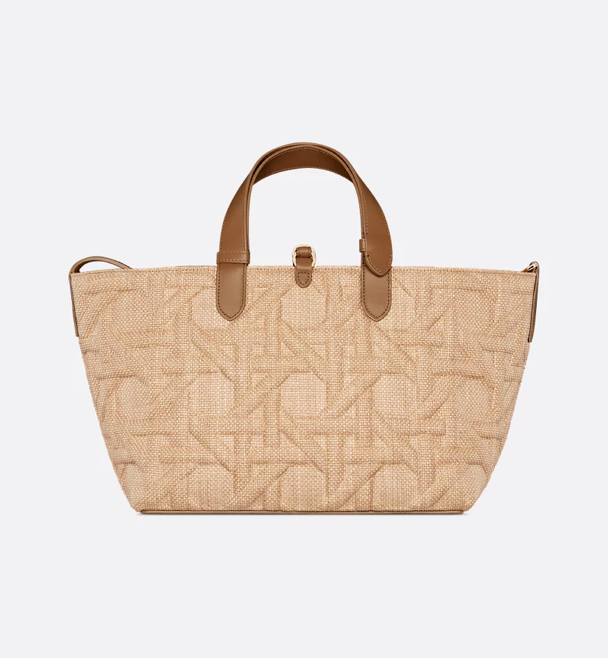 - The Dior Toujours bag is distinguished by a casual and practical design. Crafted in beige raffia, it showcases the Graphic Cannage motif, offering a modern 3D version of the House icon. The style features a spacious interior compartment with a matching pouch to organize the essentials. Its thin leather strap closure keeps items secure while the D of the CD Lock clasp twists to adjust the sides and enhance the bag’s silhouette. The leather top handles can be adjusted using the small notches so the medium bag can be carried by hand or worn over the shoulder.