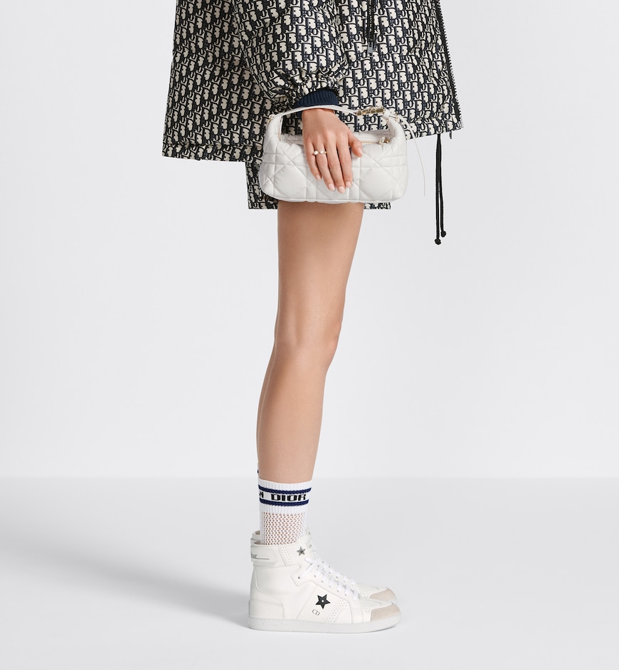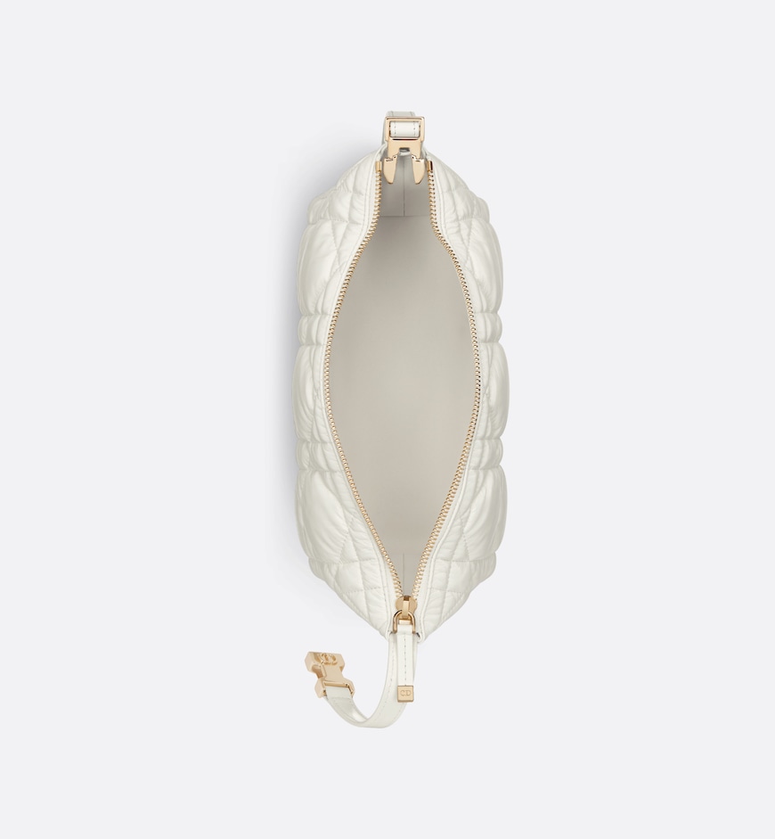 - Maria Grazia Chiuri’s DiorTravel Nomad pouch is a modern hybrid design. Crafted in latte calfskin, it stands out with a unique Macrocannage quilted effect, and a spacious and flexible form that will accommodate all the essentials. The medium style can be carried by hand or worn over the shoulder thanks to the top handle, complete with a military-inspired pale gold-finish metal CD buckle, while one of the House’s embroidered shoulder straps can be attached to the side rings.