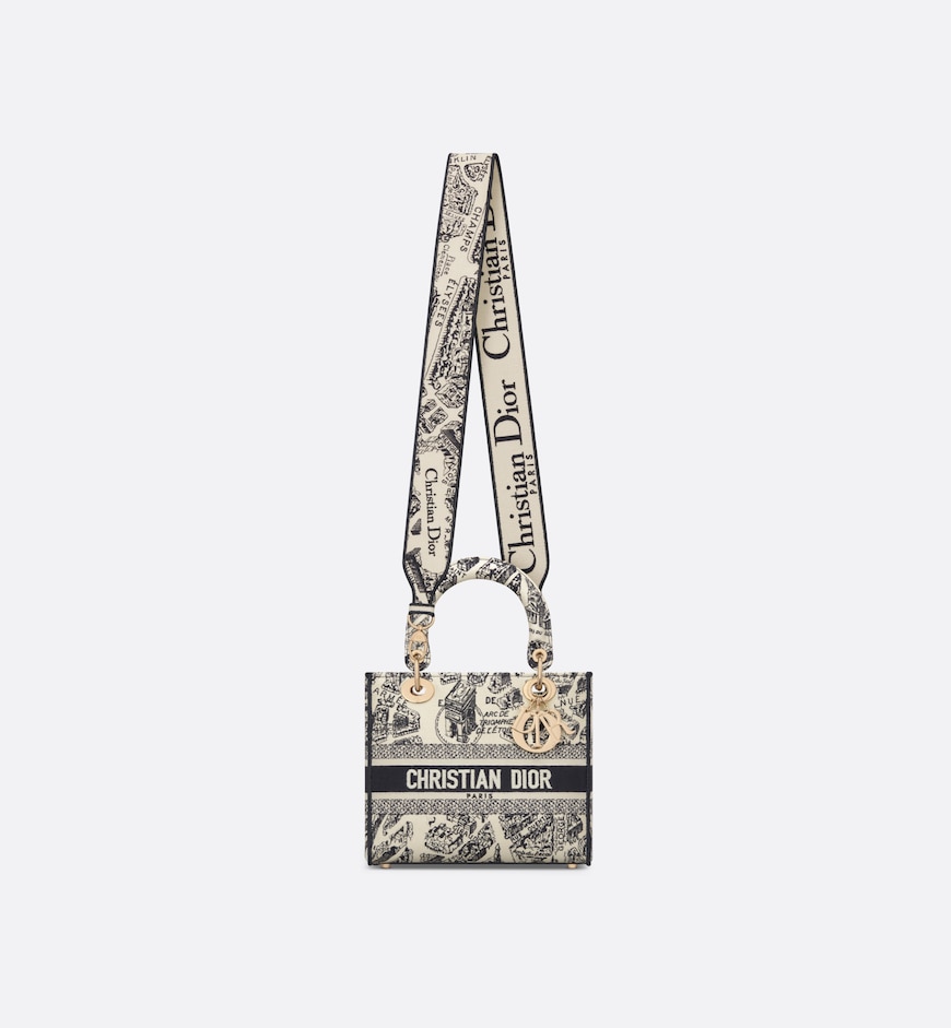 - The Lady D-Lite bag combines classic elegance with House modernity. The style is fully embroidered with the beige and navy blue Plan de Paris motif, inspired by House archives and centered around Dior’s historic address on Avenue Montaigne. The front features a Christian Dior Paris signature while the D.I.O.R. charms in pale gold-finish metal embellish and illuminate the silhouette. Equipped with a wide, reversible and removable embroidered shoulder strap, the medium Lady D-Lite bag can be carried by hand or worn crossbody, and can be styled with other Plan de Paris creations.