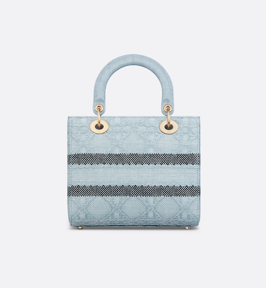 - The Lady D-Lite bag combines classic elegance with House modernity. Crafted in sky blue raffia, it showcases hallmark Cannage stitching. A Christian Dior Paris signature adorns the front, while D.I.O.R. charms in pale gold-finish metal embellish and illuminate the silhouette. Featuring a wide, removable and reversible embroidered shoulder strap, the medium Lady D-Lite bag can be carried by hand or worn crossbody.