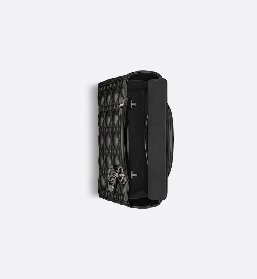 - The Lady Dior bag epitomizes the House’s codes. Sleek and refined, the timeless style is crafted in black lambskin with Cannage stitching, its quilted texture instantly stands out and it is completed by a tonal suede calfskin interior, while the ruthenium-finish D.I.O.R. charms further embellish the modern and bold silhouette. The medium Lady Dior bag features a thin, removable leather shoulder strap and can be carried