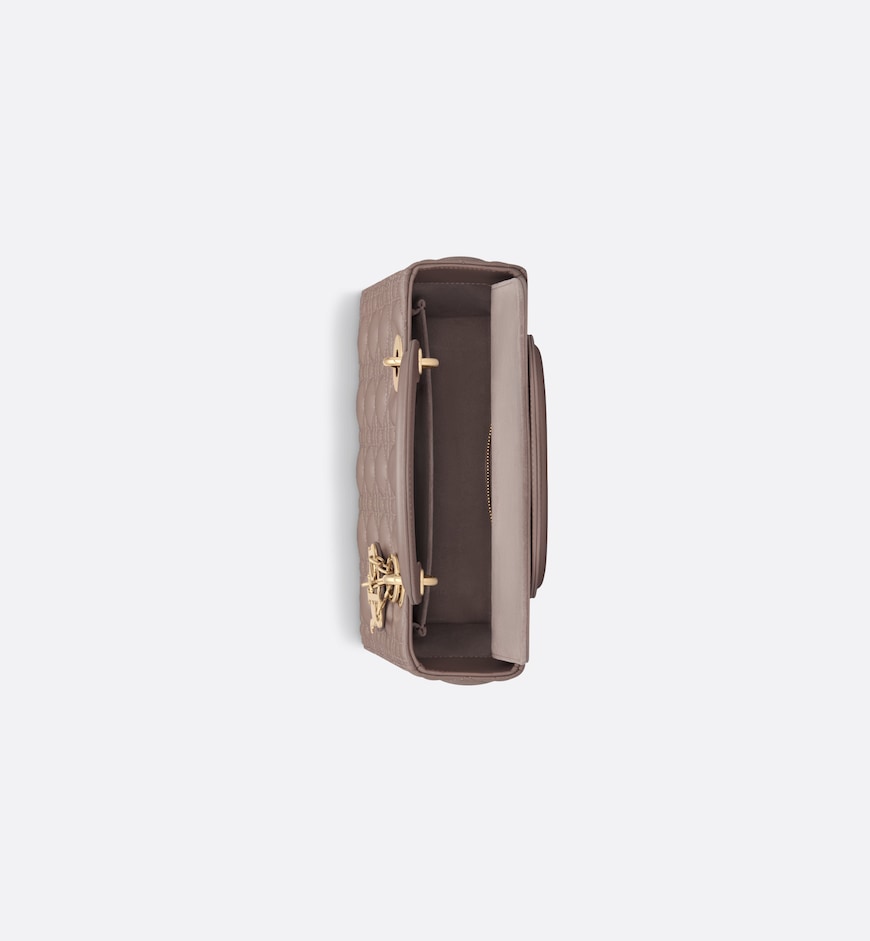 - The Lady Dior bag epitomizes the House’s vision of elegance and beauty. Sleek and refined, the timeless style is crafted in warm taupe lambskin with Cannage stitching, creating the instantly recognizable quilted texture, while the pale gold-finish metal D.I.O.R. charms offer an elegant touch. Featuring a thin, removable leather shoulder strap, the medium style may be carried by hand or worn crossbody.