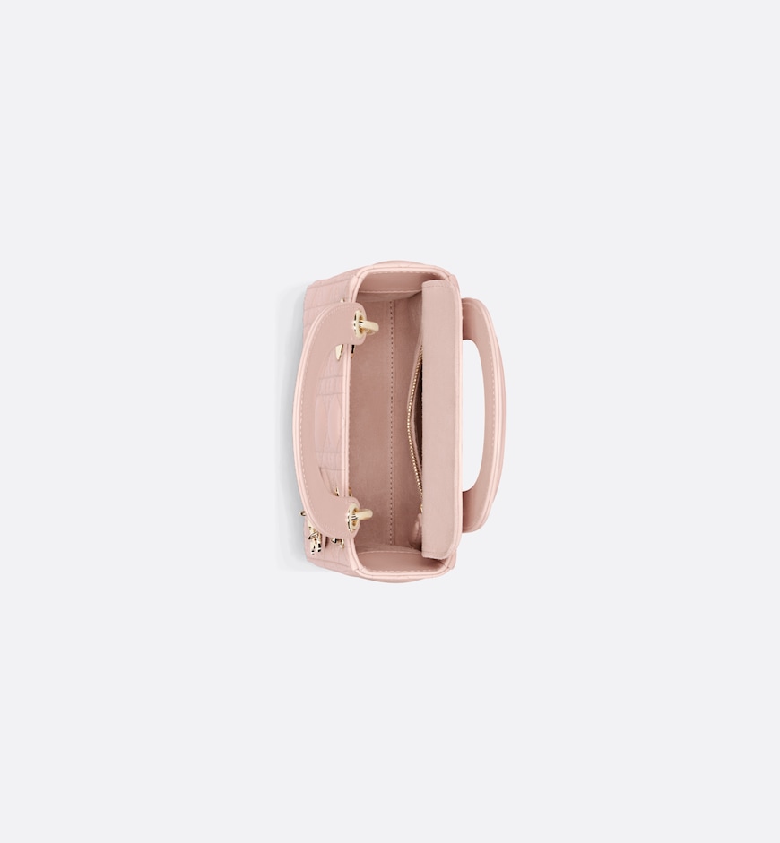 - The Lady Dior bag embodies Dior’s vision of elegance and beauty. Sleek and refined, the timeless and modern style is crafted in powder pink lambskin with Cannage stitching, creating the instantly recognizable quilted texture. Pale gold-finish metal D.I.O.R. charms further embellish and highlight its silhouette. Featuring a removable chain shoulder strap, the miniature Lady Dior bag can be carried by hand,