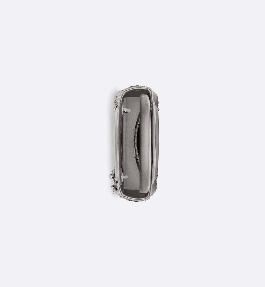 • The Lady Dior bag epitomizes the House’s vision of elegance and beauty. Sleek and refined, the creation is timeless. Crafted in gray satin and covered with strass for sophisticated evening allure. The palladium-finish metal signature D.I.O.R. charms embellish and illuminate its silhouette. Featuring a thin removable satin shoulder strap, the miniature Lady Dior bag can be carried by hand or worn crossbody as an ideal evening wear companion.