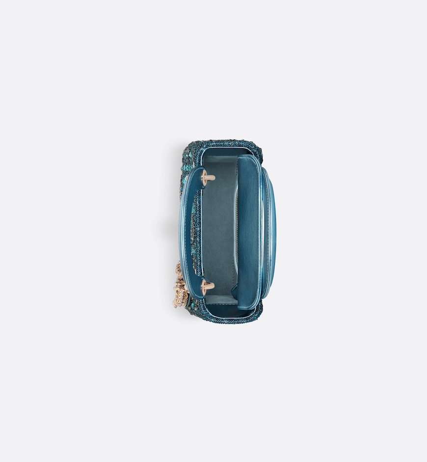 • The Lady Dior bag epitomizes Dior’s vision of elegance and beauty. It demonstrates the House’s unique leather craftsmanship and is offered in celestial blue satin, embroidered with a multitude of beads in a hallmark Cannage-motif design, while the handles are made with tonal metallic calfskin. The pale gold-finish metal D.I.O.R. charms are adorned with white crystals and further embellish its silhouette. The miniature style, with its removable chain shoulder strap, can be carried by hand or worn crossbody and will be the ideal evening companion.