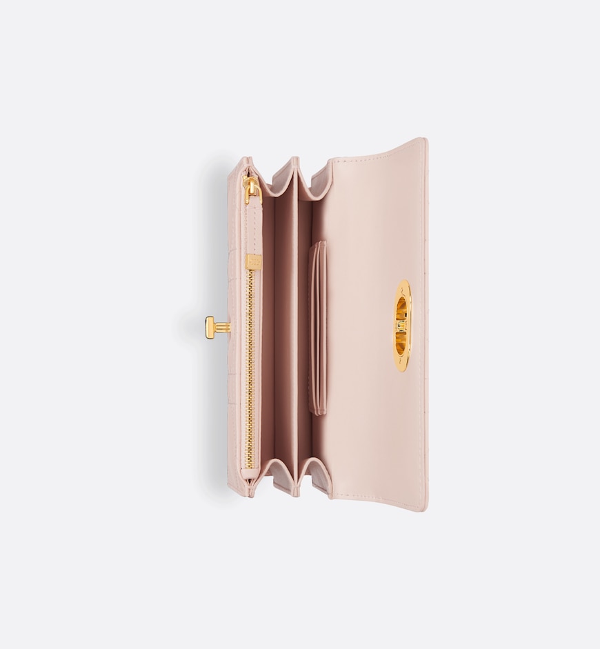 - The Miss Caro mini bag enhances the Dior Caro line with modern and timeless elegance. Crafted in powder pink lambskin, it stands out with the unique quilted effect of Macrocannage stitching, as well as a flap accented by a gold-finish metal CD twist clasp inspired by the seal of a Christian Dior perfume bottle. Alternating between gold-finish metal links and tonal enamel links that match the leather, the adjustable chain shoulder strap has a leather insert for added comfort when carrying the bag by hand, wearing it over the shoulder or crossbody.