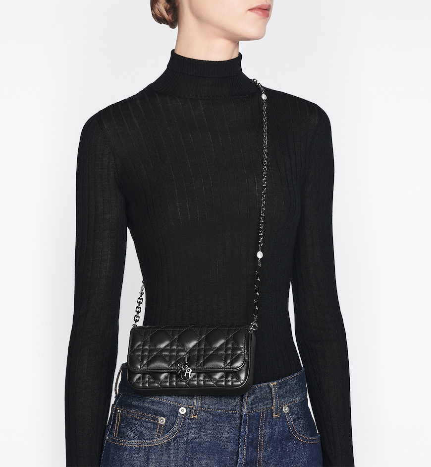 - The My Dior – Dior Talk Phone Pouch is a clever and sophisticated creation. Crafted in black Cannage lambskin, it features pale gold-finish metal D.I.O.R. charms. Completed by an elegant removable chain punctuated with resin pearls, the phone pouch can be carried by hand, worn over the shoulder or crossbody.