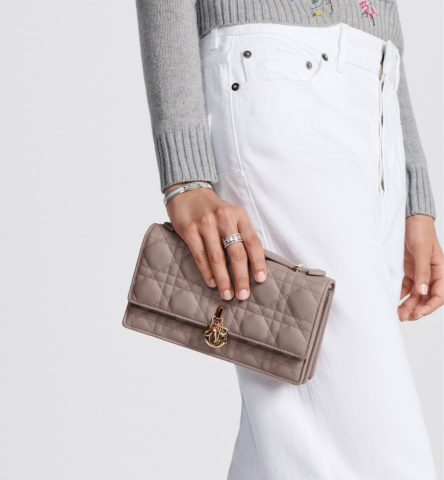 - The My Dior mini bag elevates the line with an elegant and functional design. Crafted in warm taupe lambskin with Cannage stitching, it features a flap enhanced by D.I.O.R. charms on the front. Equipped with compartments and card slots, the functional accessory holds all the essentials and is the ideal day and evening companion. A top handle completed by a removable chain punctuated with resin pearls allows the bag to be carried by hand or worn crossbody.