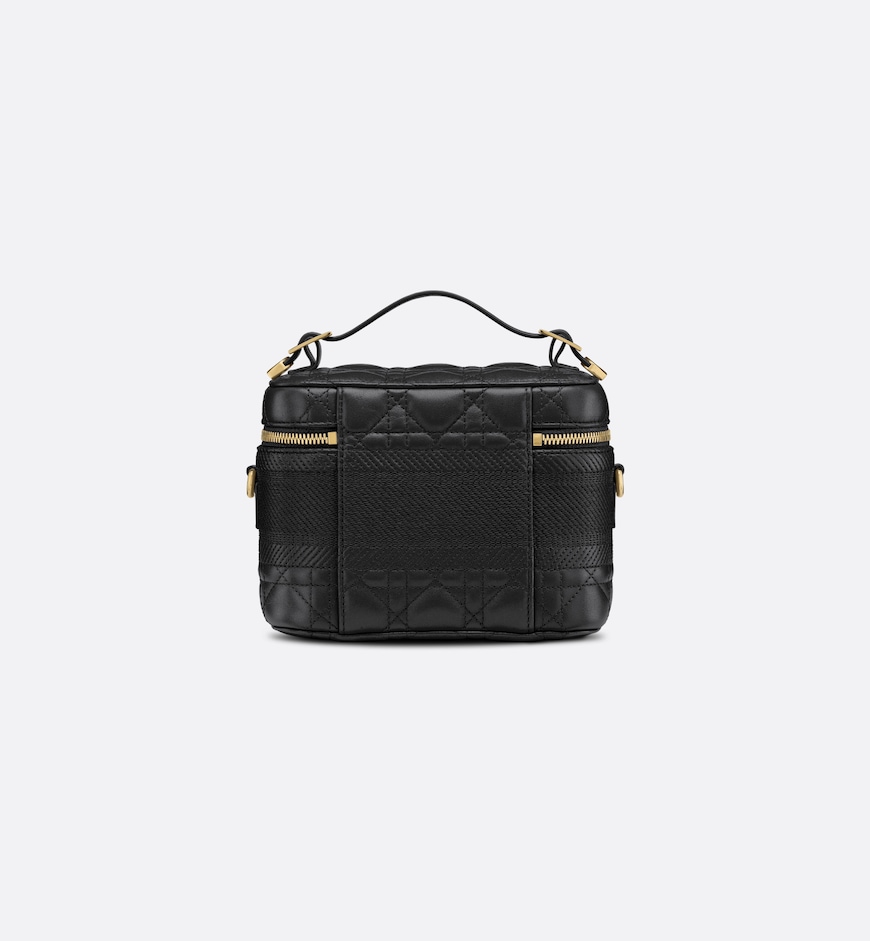 • The DiorTravel vanity case is crafted in black supple lambskin and showcases shiny antique gold-finish metal details. It is enhanced by Cannage topstitching and a band embossed with the Christian Dior signature. The design can accommodate a phone, a wallet, a case for wireless earphones and a notebook. The small accessory is an ideal daily companion and can be carried by hand, worn over the shoulder or crossbody thanks to its handle and removable shoulder strap.