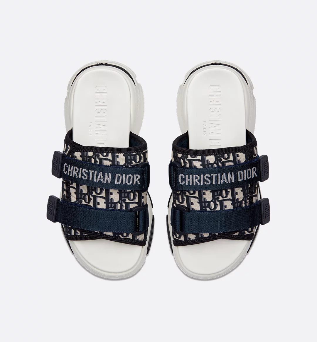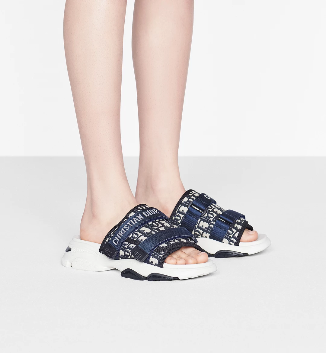 The D-Wander slide is a hybrid design combining both sneaker and sandal. Featuring a comfortable ultralightweight EVA sole with adjustable self-fastening straps, it has an athletic and relaxed silhouette. The deep blue Dior Oblique motif on the upper and the Christian Dior signature on the upper strap complete the look.