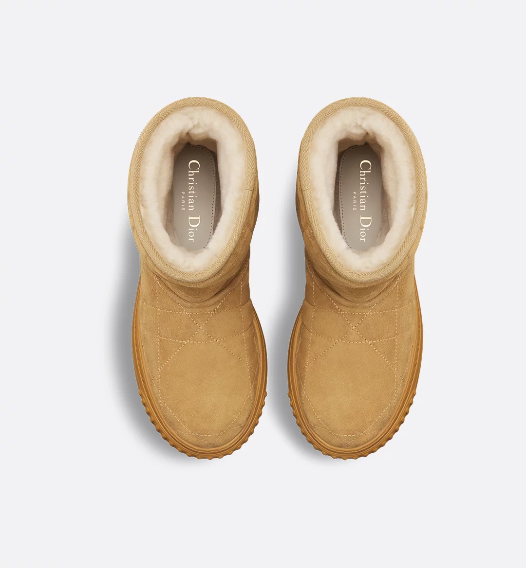 The Dior Frost ankle boot reframes the après-ski style in a couture variation. The camel suede upper showcases the Cannage motif, while the ecru lambskin shearling interior offers optimal comfort. A gold-tone Christian Dior Paris signature on a tonal leather panel highlights the back, while the ultralightweight rubber logo sole completes the comfortable shoe.